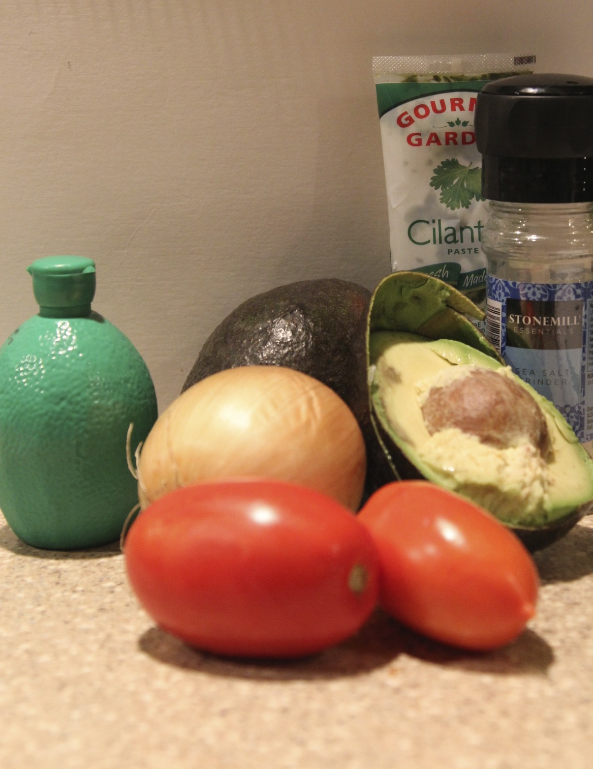 Mash up avocado with fork, add in onion, jalapeño, tomatoes, lime juice, cilantro and salt and pepper to taste.
