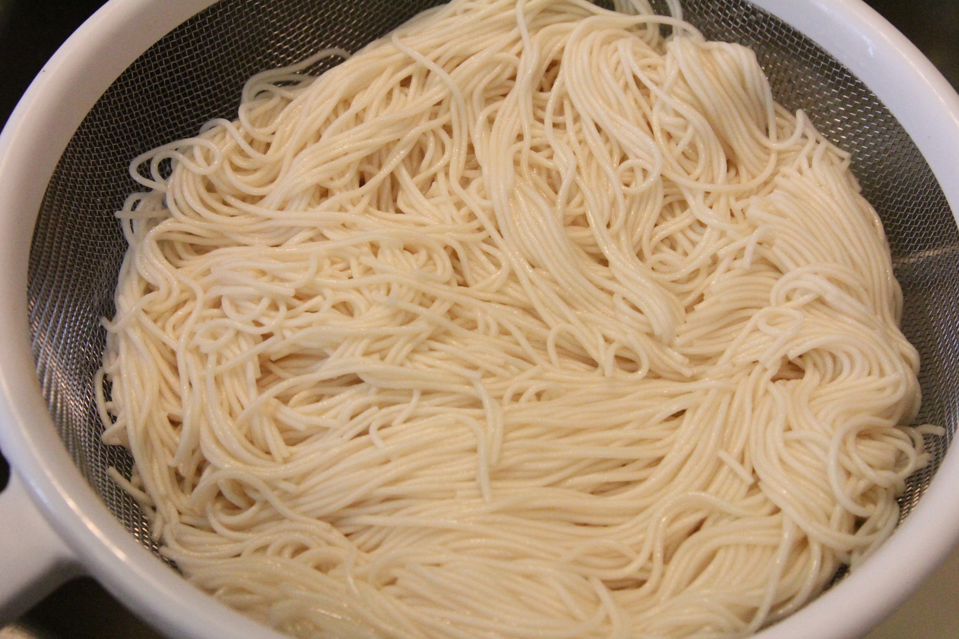 Bring a large pot of water to a boil and boil the noodles per package directions. Drain the noodles and rinse with cold water.