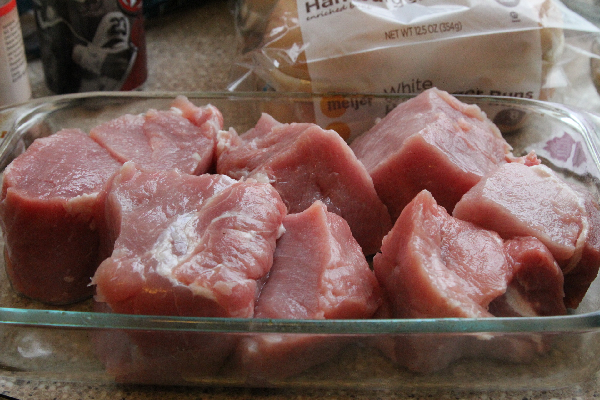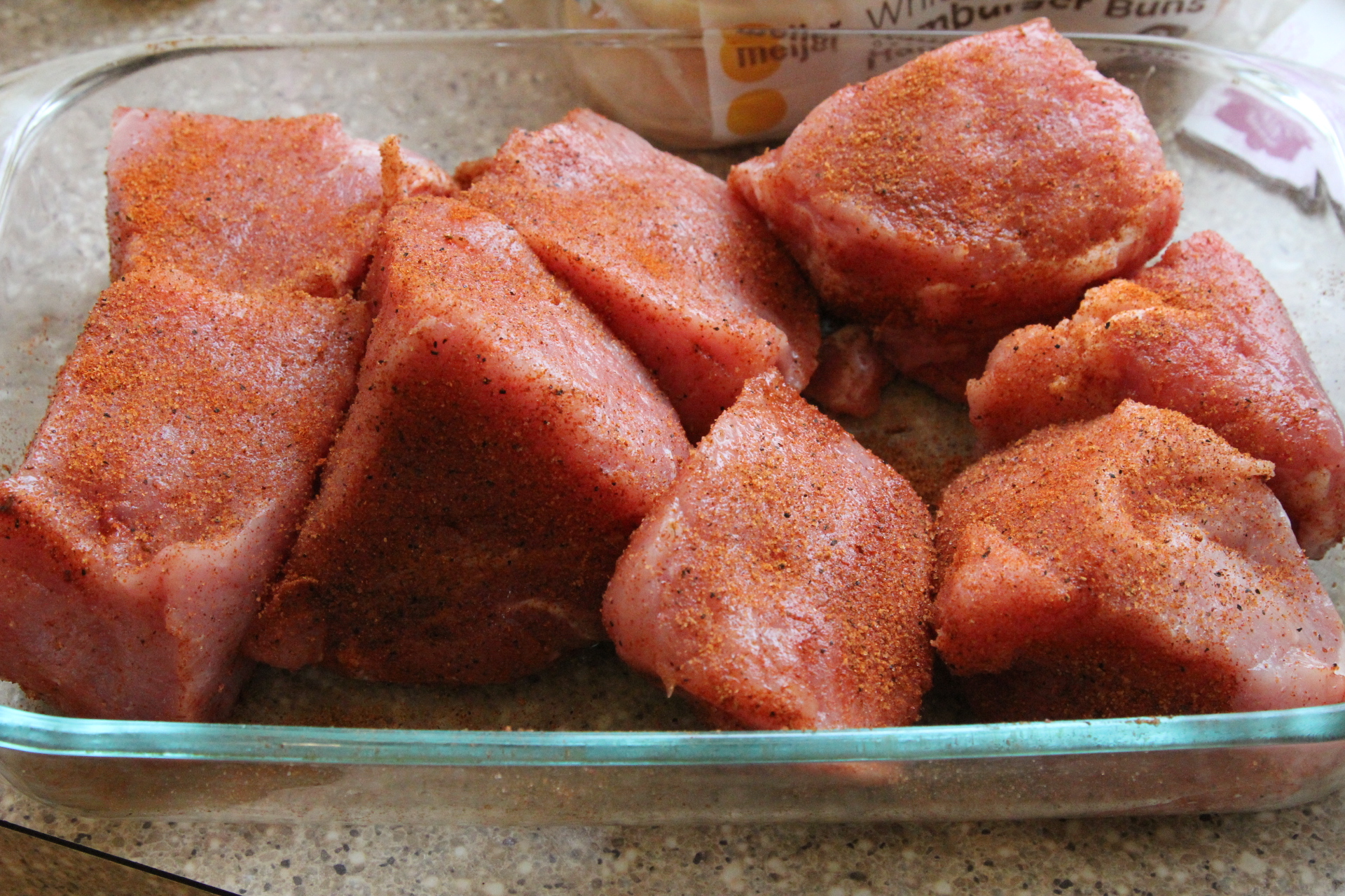 Trim excess fat and silver skin off of pork loin. Cut the loin into large chunks. Season all sides generously with rub.