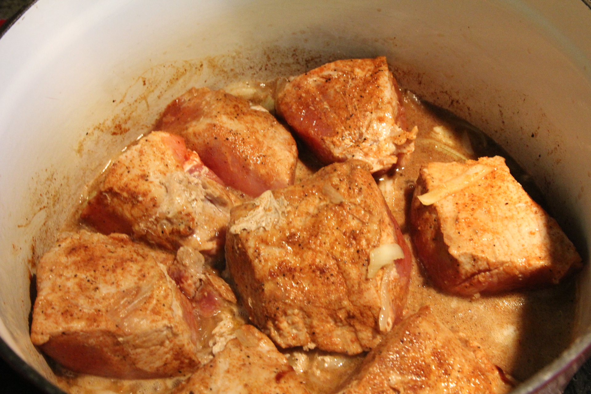 Add in the chunks of pork loin and sear on medium – high heat for a minute or two on each side to achieve a nice crust.