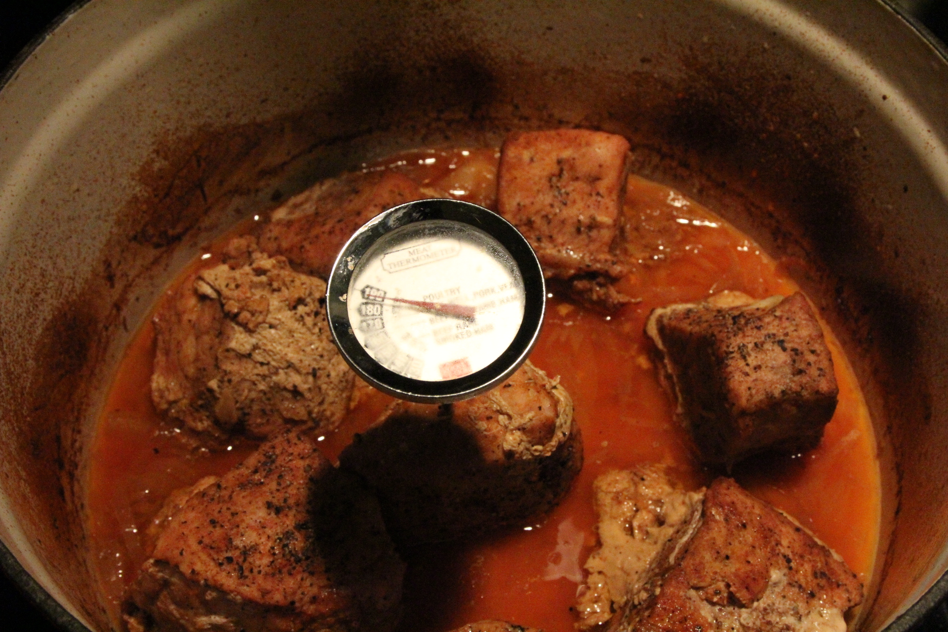 Add in one can of Dr Pepper soda, cover the pot and transfer to 325 degree oven for 1 – 1 1/2 hours depending on size or until the meat reaches an internal temperature of about 190 degrees.