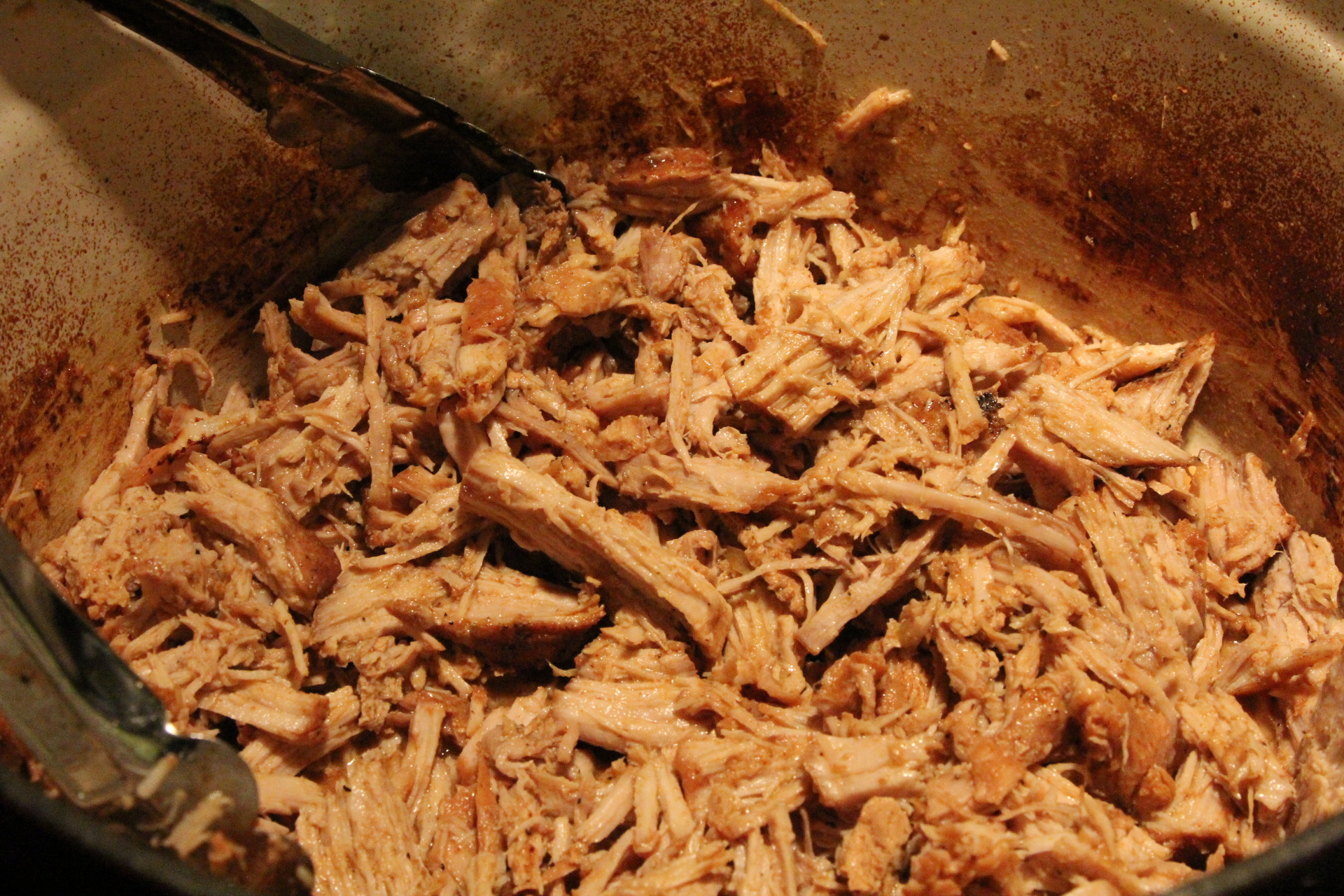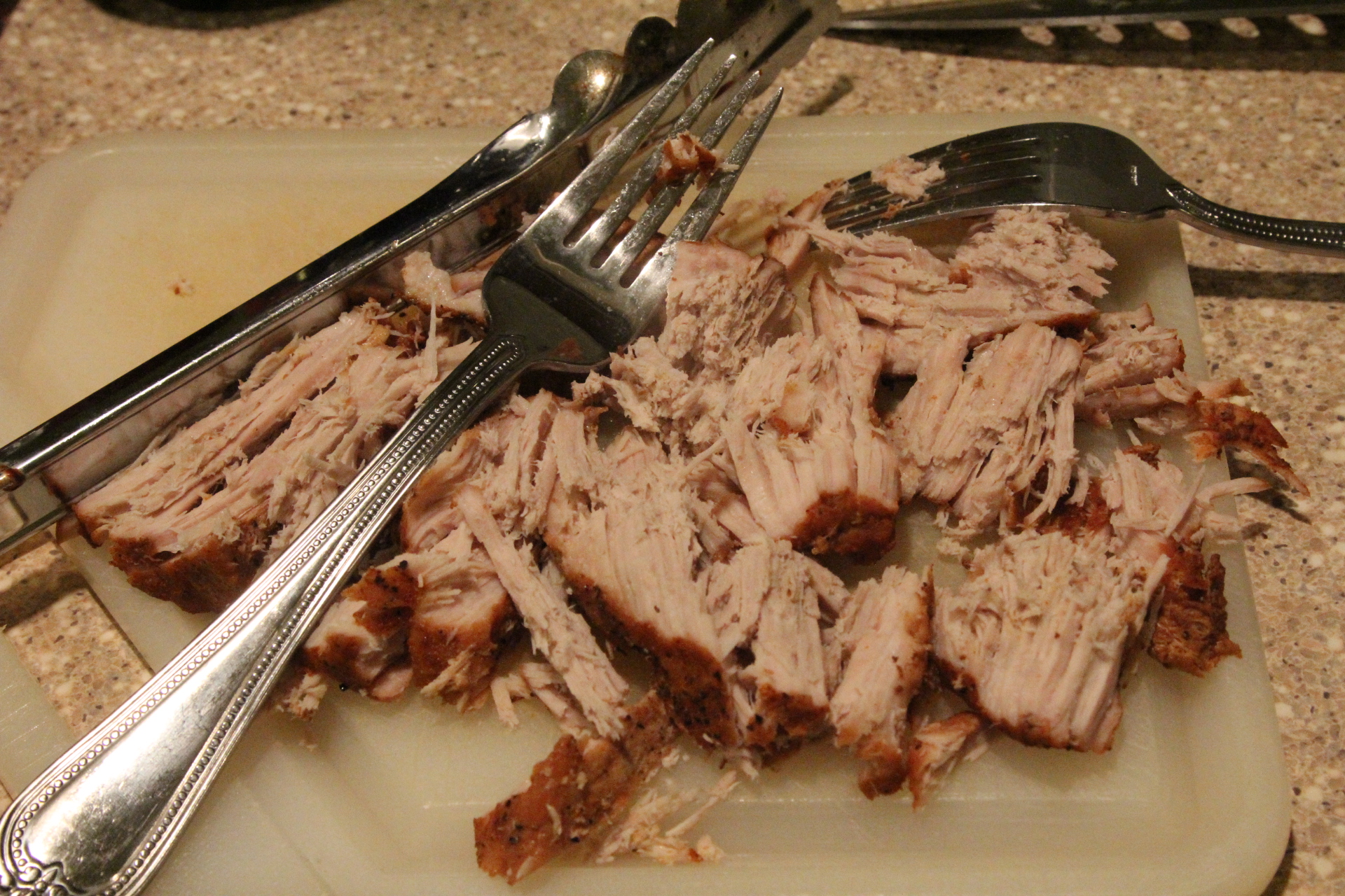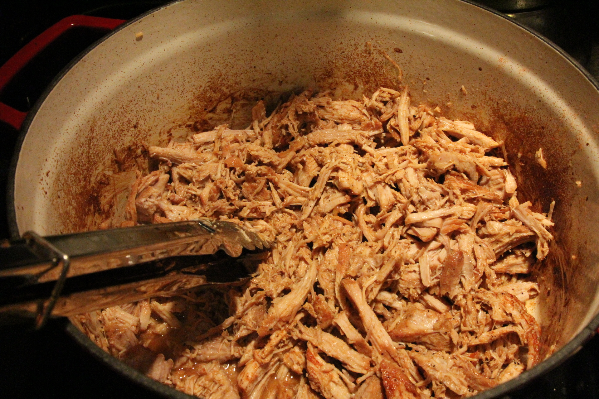 When ready, shred the pork using fork, knife, or whatever you like. I just use two forks. I do a couple chunks at a time and then return them to the big dutch oven pot.