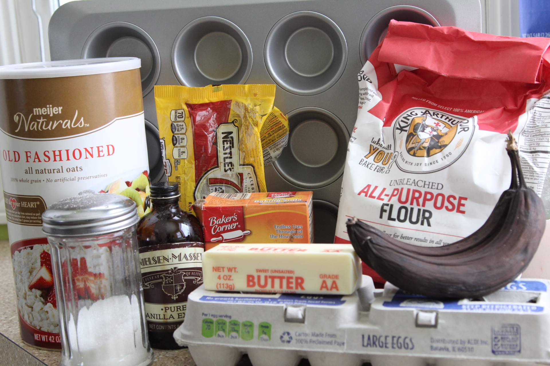Today is the second snow day this week. No school, no preschool, but yet bitterly cold windchill outside so you can forget about playing in that snow that just keeps coming down. It looks so pretty in the trees behind our yard. Very peaceful and quiet, but then in the back of your mind you are thinking about how you have to eventually get out there and shovel your vehicle out and clear off your sidewalks and driveway. I thought about getting out there and shoveling, but I just had this urge to bake something and well baking won! Shoveling can wait, there’s muffins to be made! I had these two very over ripe bananas just waiting to be turned into banana bread or muffins. Each time I walked by the fruit in the kitchen, I thought that I should make that bread. Well, I finally got around to it and the Chocolate Chip Banana Oat Muffins turned out great! You don’t have to include the chocolate and you could add in nuts to the batter if you like. Play around with the ingredients to make them however you like!