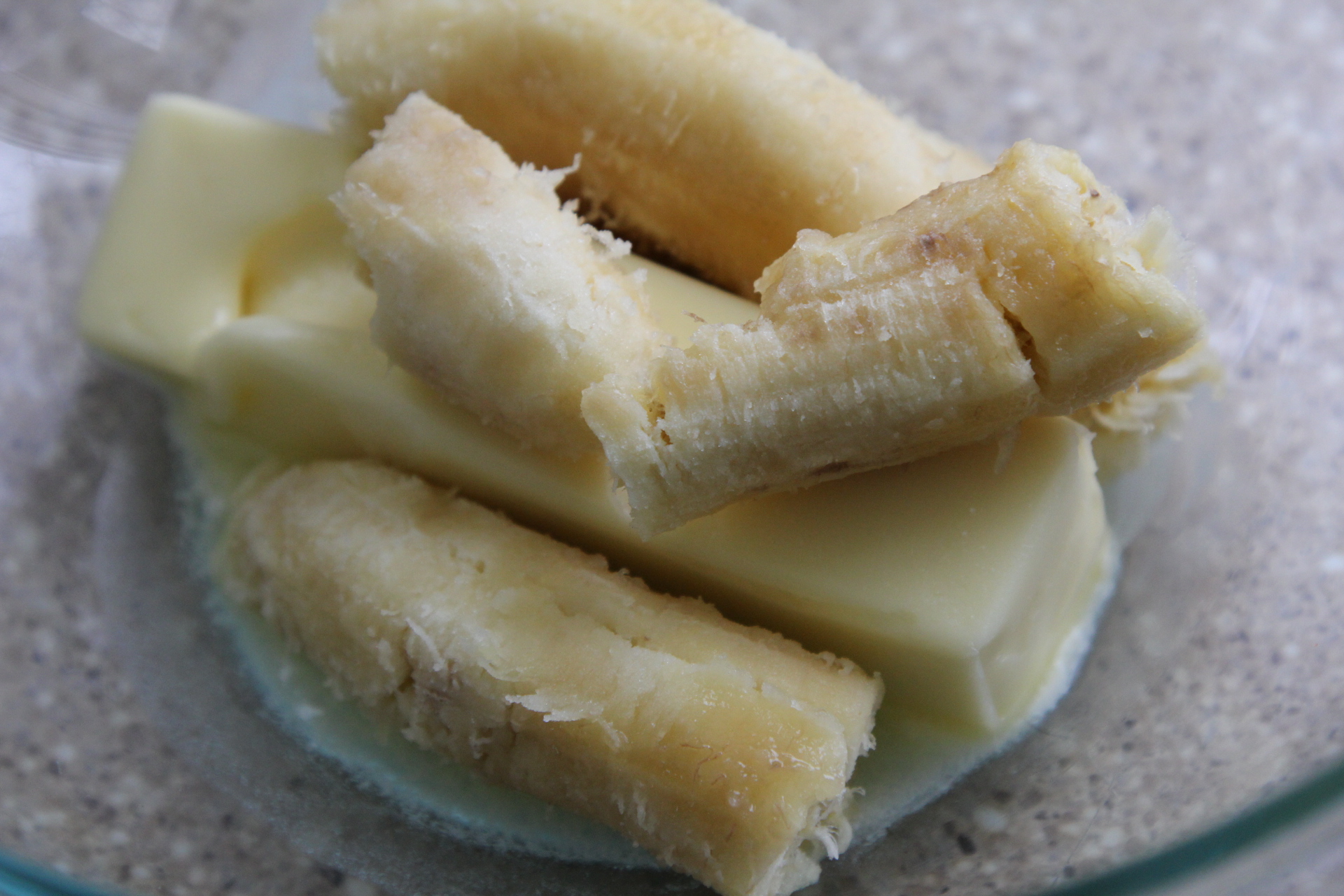 In a large bowl, add softened butter and peeled bananas. Mash with a fork.
