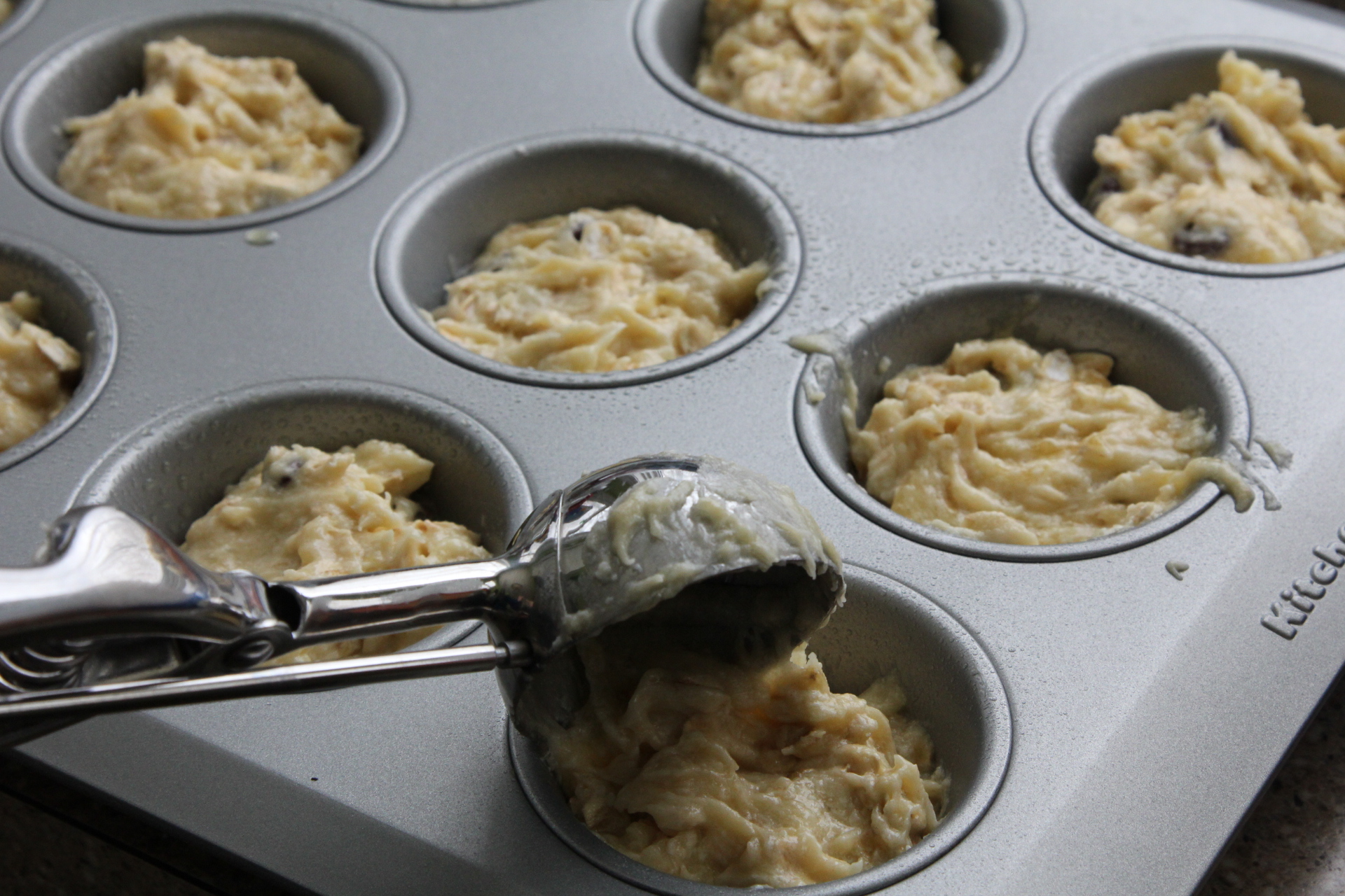 Add batter to greased muffin pan, or use muffin liners. I use a large ice cream scoop for filling the muffin cups. You could also pour batter into a greased loaf pan to make bread.