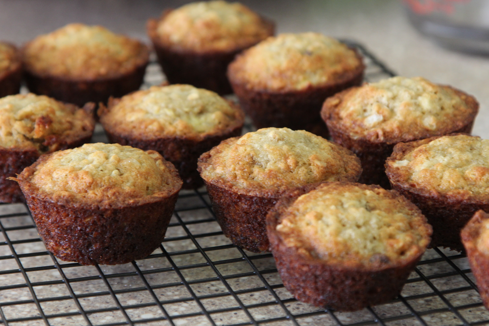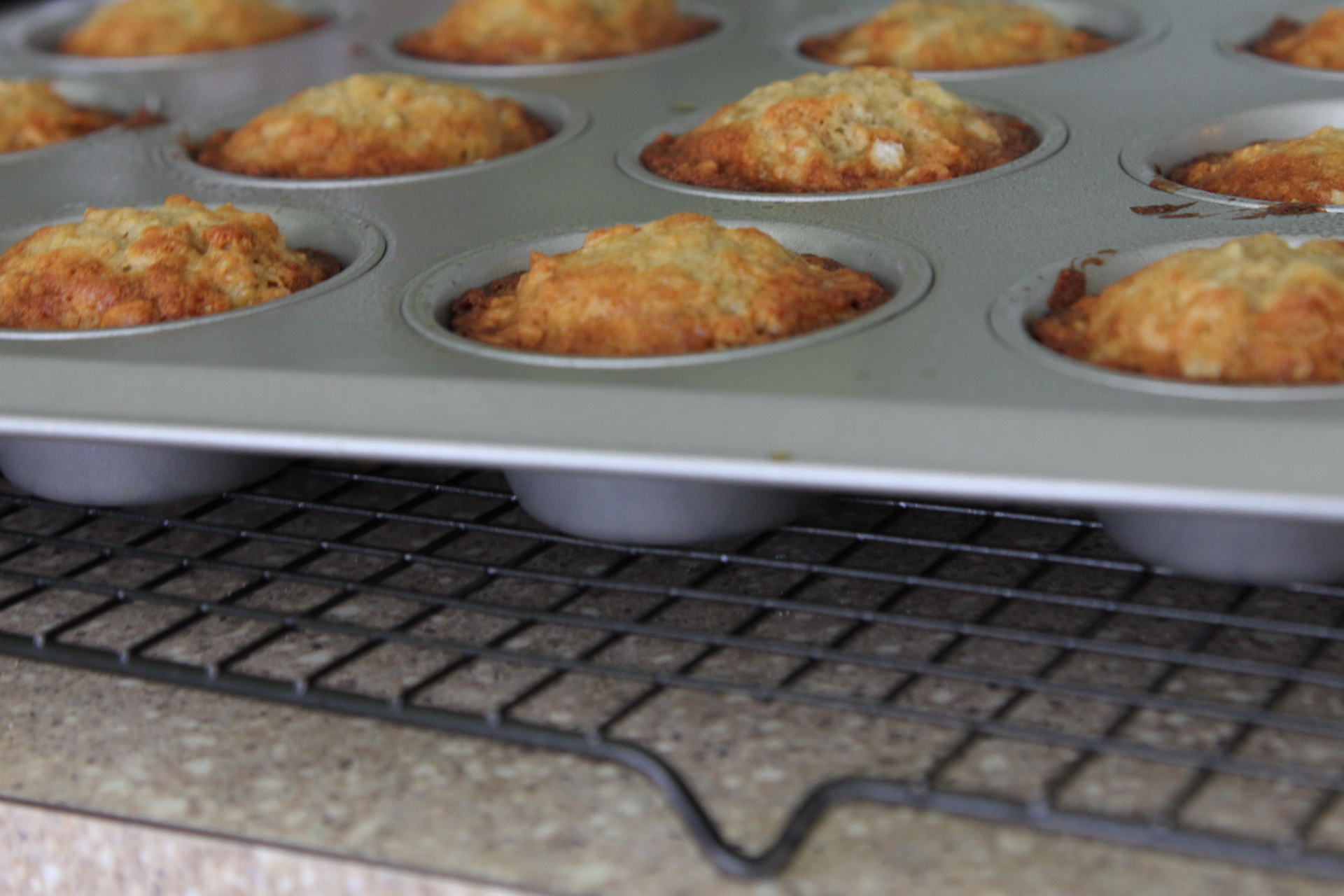 After about 10 minutes, take a butter knife and carefully cut around the edges of each muffin and remove them from the pan. Let the muffins continue to cool on the cooling rack.