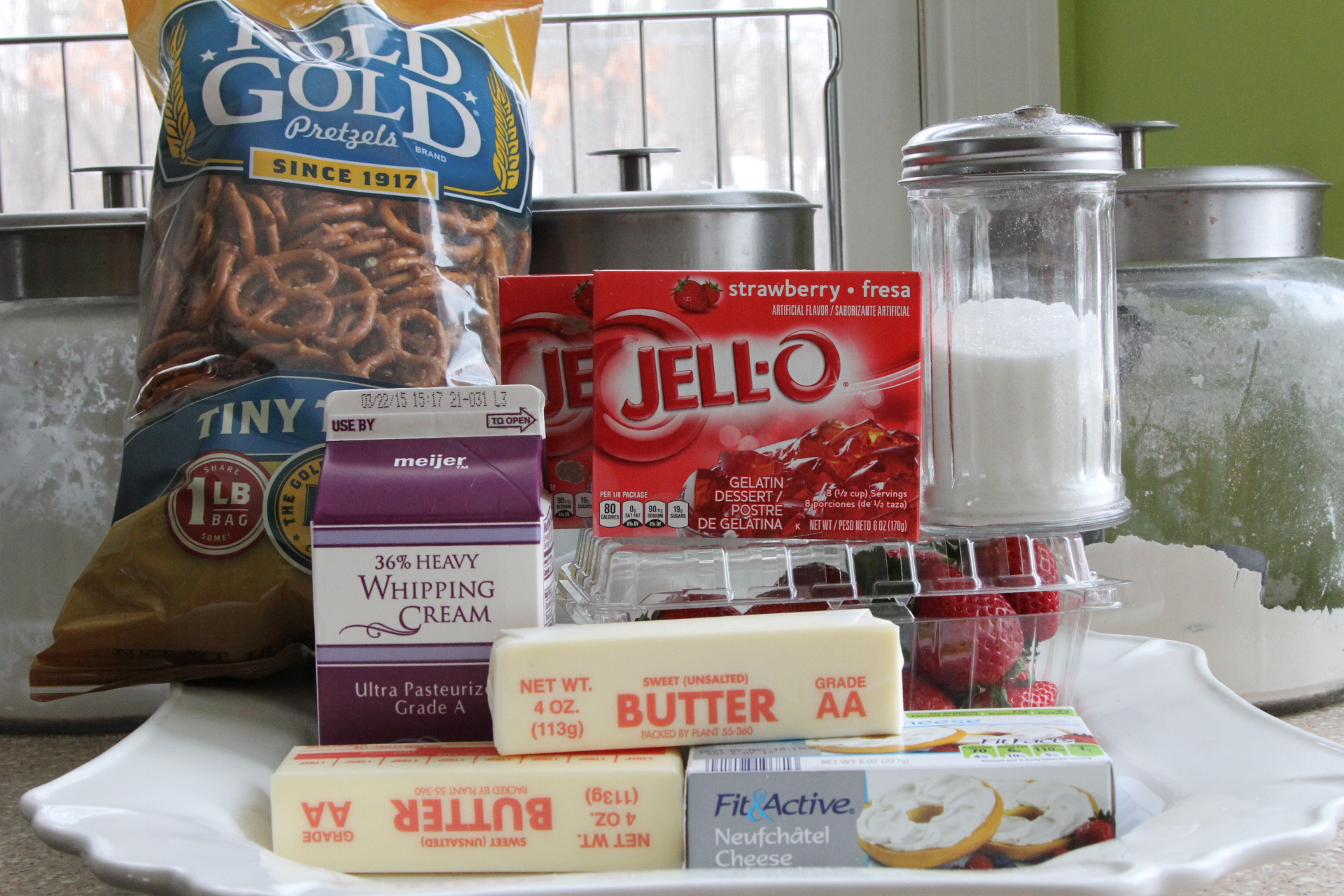Picture a love struck teenager sitting at a back table of the library in study hall chatting with one of her friends. This was me. It was 1997. We weren’t discussing the upcoming Basketball game or who was dating who. We were discussing recipes! I wanted to make a special Valentine’s Day meal for my love and my friend was helping me with the recipe for one of his all time favorites, a special treat that his mom made, Strawberry Pretzel Salad! Now, this friend was not just any friend, she also happens to be his sister and also responsible for connecting her older brother and me together and telling him to just ask me out! So this recipe was very special. It was written down by his mom and passed along to his sister, my friend. I had never even heard of such a thing – Strawberry Pretzel Salad – what is it? Is it a salad? Is it a dessert? Whatever it is, it was his favorite and she was walking me through step by step on how to make it! I remember messing it up and forgetting to bake the crust before adding the next layer, only to have floating pretzel coming up to the surface so I had to start all over. It eventually turned out ok and the dinner was wonderful! Steak, fried shrimp, baked potatoes, and this strawberry pretzel salad. I don’t make it very often, but when I do, I always think of that day in study hall, carefully reading over that special recipe that was hand written by his mom, who is now my mother-in-law and how my friend, who is now my sister-in-law walked me through all the steps of this dessert! I still seem to mess it up and I’m sure it’s not as good as his mom’s, but it’s the thought that counts and my husband still gets a big smile on his face when I bring him a big slab of it on a saucer. I’ve made a few changes to his mom’s original recipe over the years but the basics are the same. That sweet, salty, and buttery combination is still what makes this special! I call it Strawberry Pretzel Dessert because it is just too sweet and yummy to be considered a salad in my book, but whatever category you file it under, it’s a delightful treat!