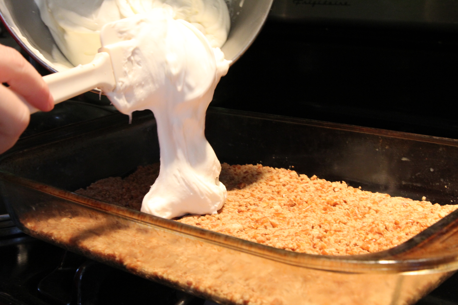 Press Pretzel crust into bottom of 9 x 13 inch oven safe pan.