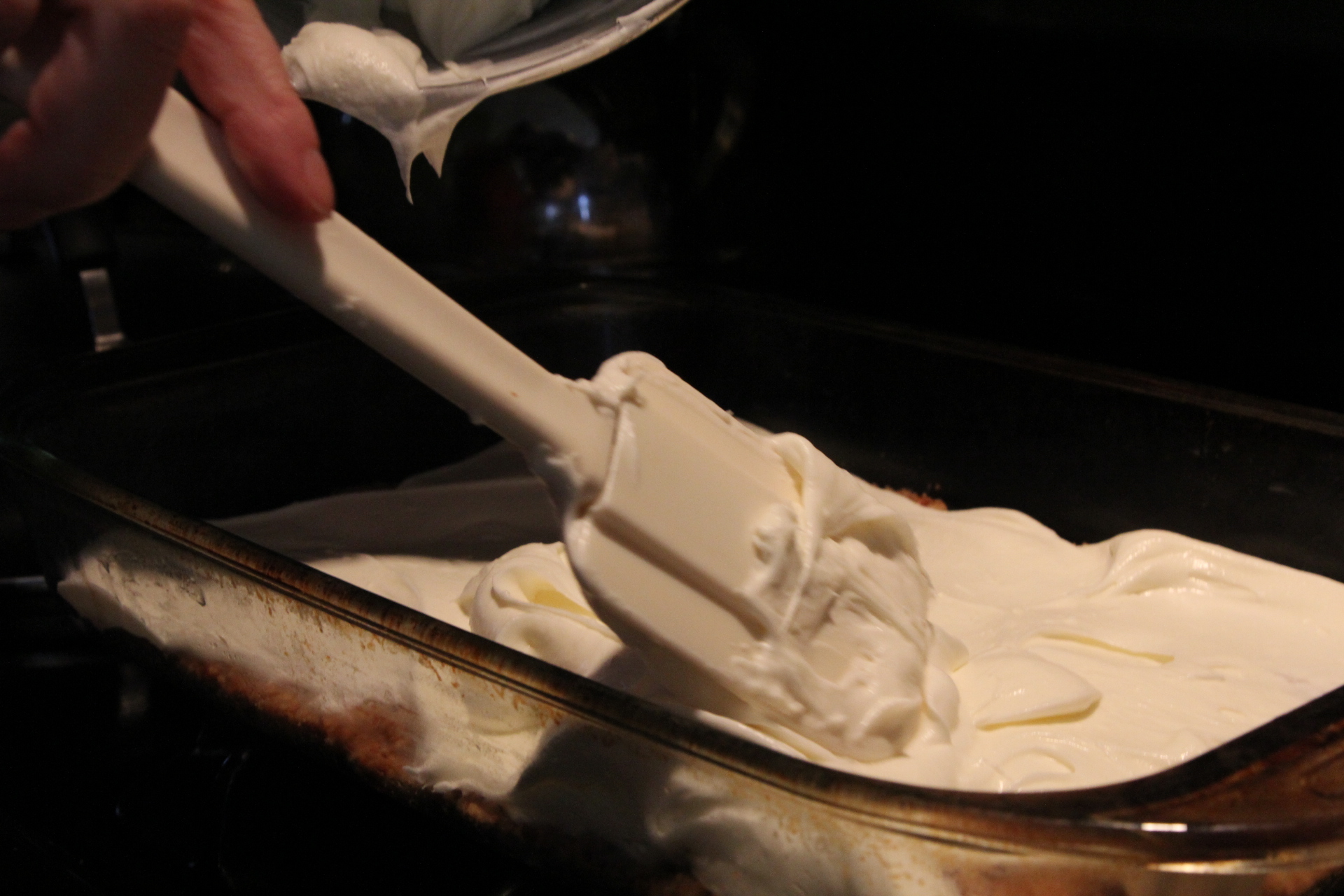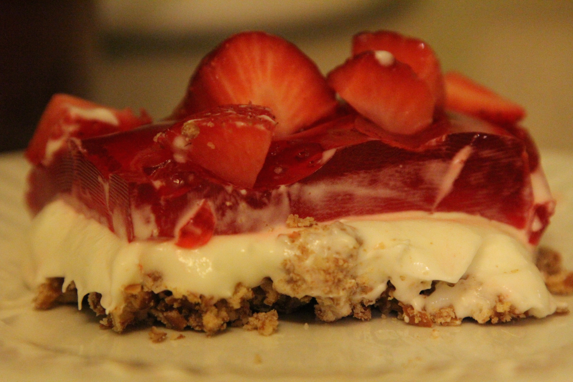 Let this chill in the fridge for 3 minutes or so and then add in sliced strawberries and pour it over the filling layer. I made the mistake this time of pouring the Jell-O layer over filling and letting it set up a bit in the fridge and then adding the strawberries on top. DON’T DO THIS! The Jell-O set up too much and the strawberries didn’t really sink into the Jell-O so they kept sliding off the top when I served it. Instead, add the strawberries to the Jell-O mixture while it’s still liquidy and then pour it over the filling mixture. You can use a spoon to gently arrange the strawberries evenly throughout the Jell-O before it sets up.