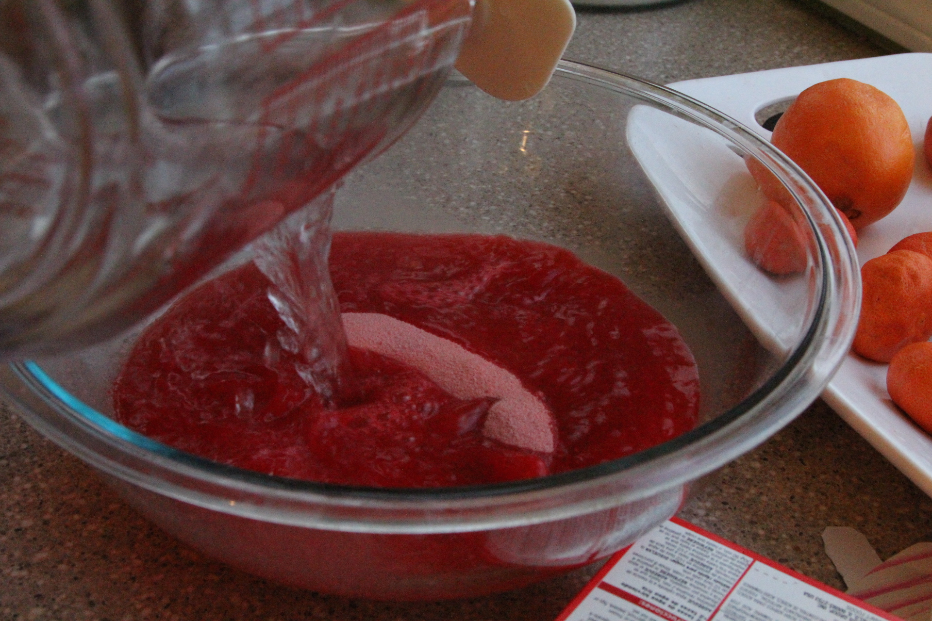 Once the filling mixture has chilled for at least 30 minutes, combine the 2 Jell-O packages with 2 C of boiling water and 1 1/2 C cold water in a medium bowl.