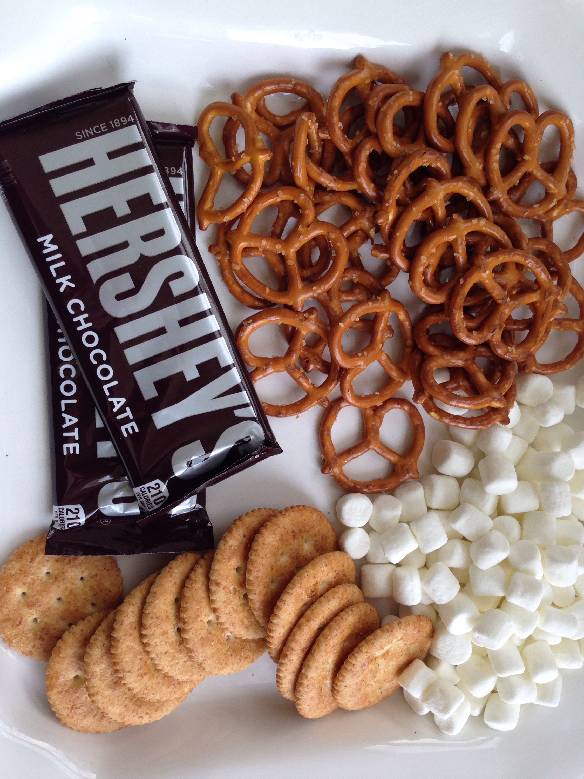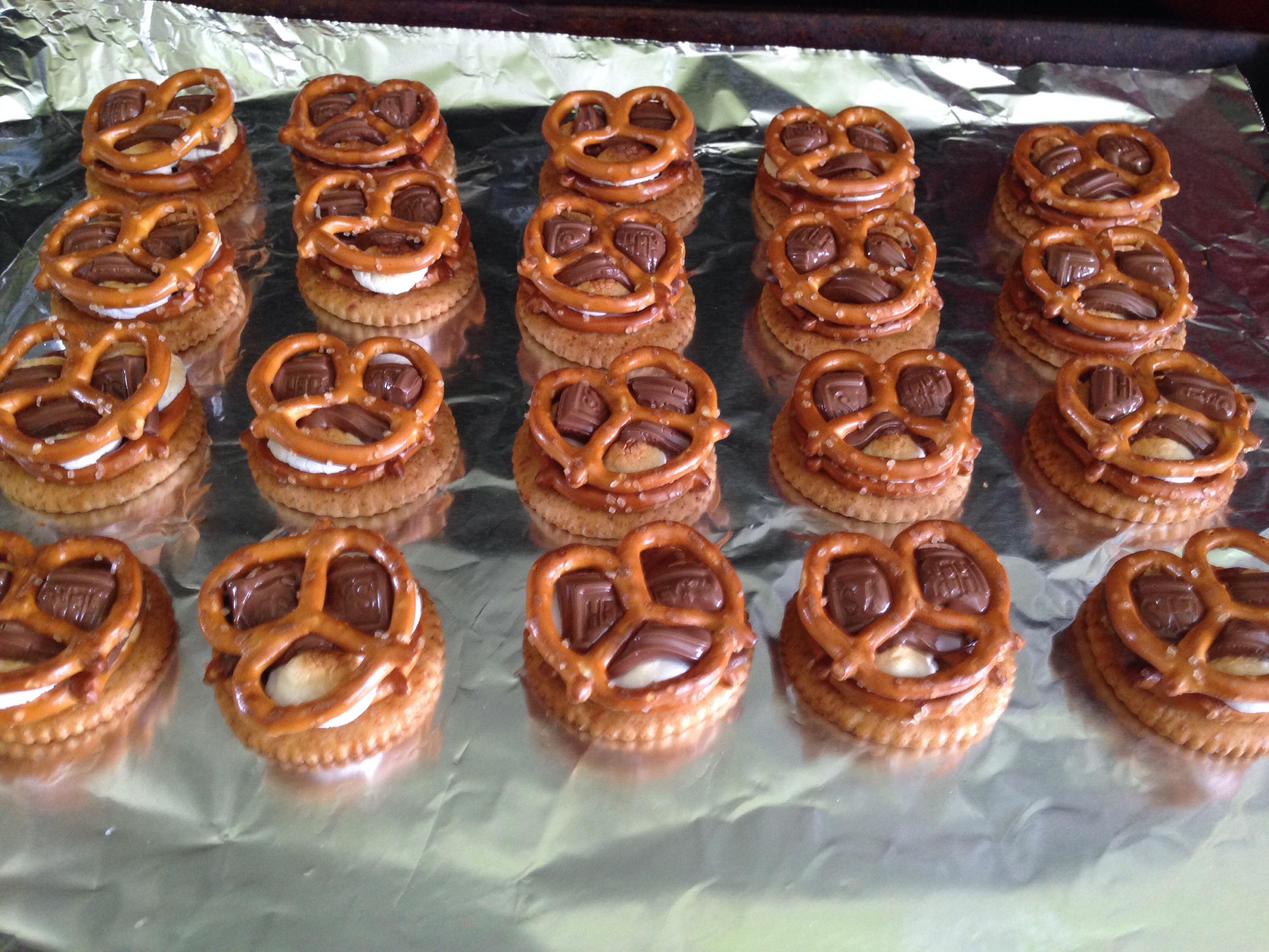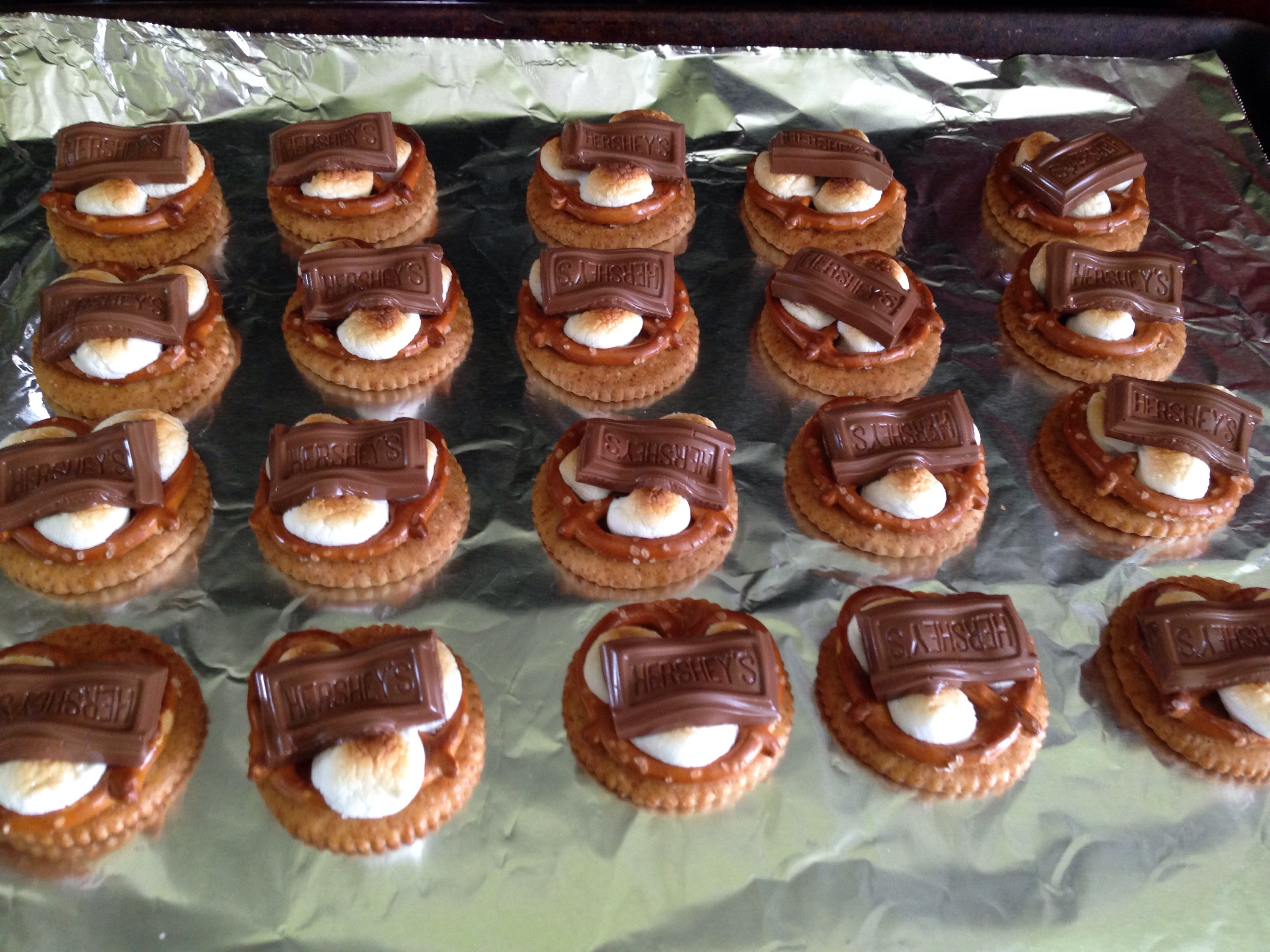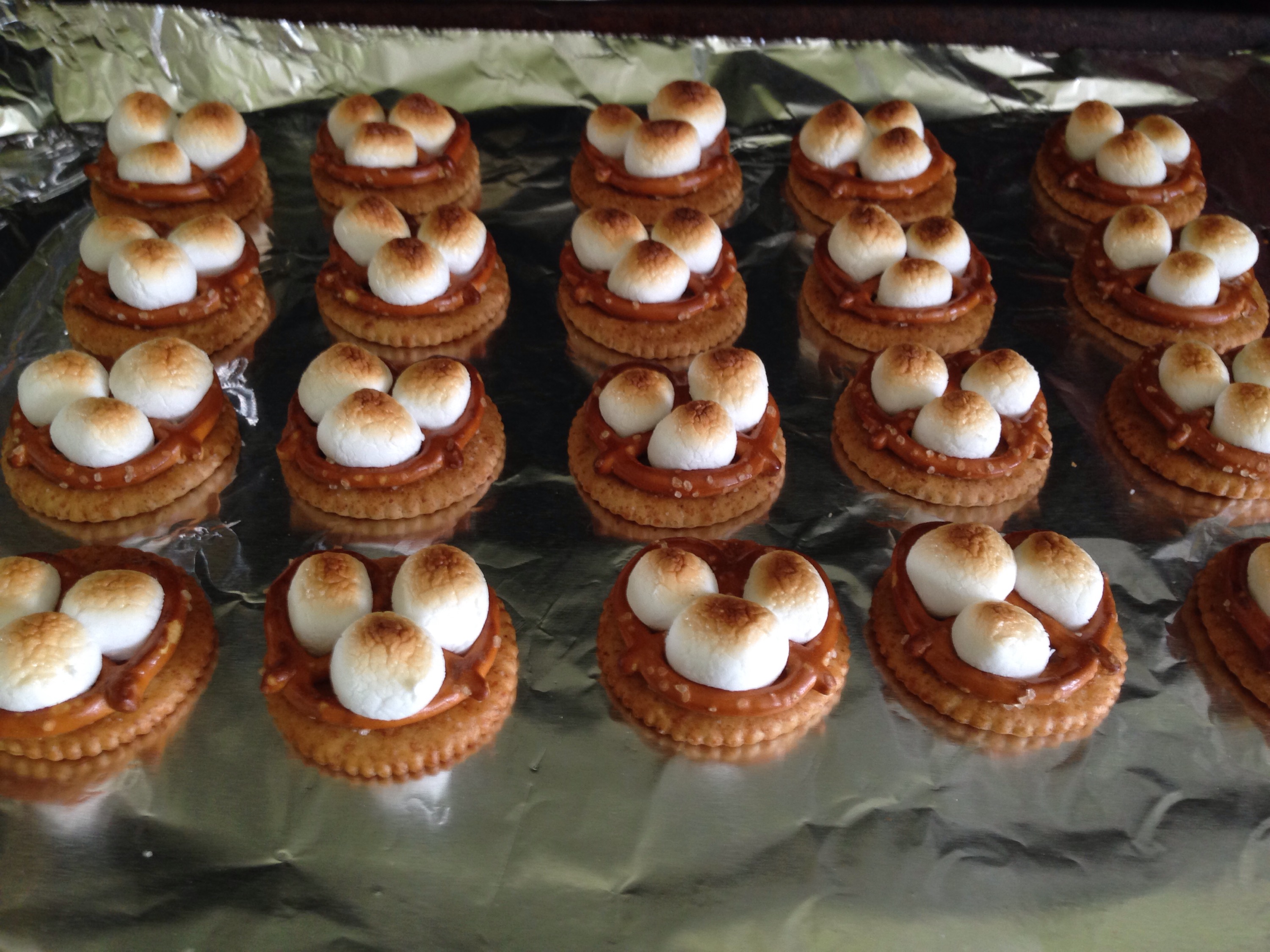 Place pan with crackers, pretzels and marshmallows into oven and broil on Hi for 2-3 minutes until lightly golden toasted.