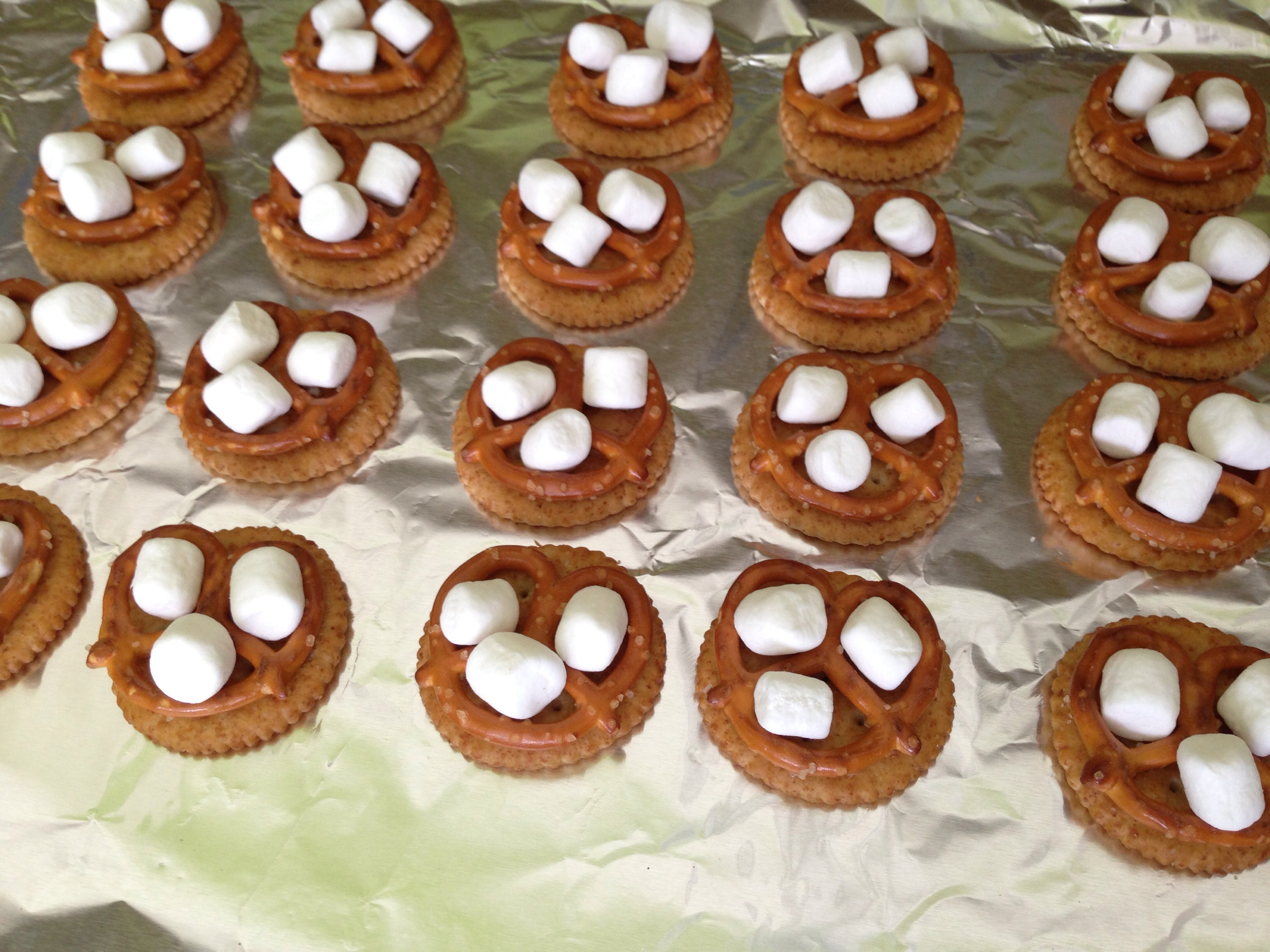 Add three marshmallows on top of each pretzel.