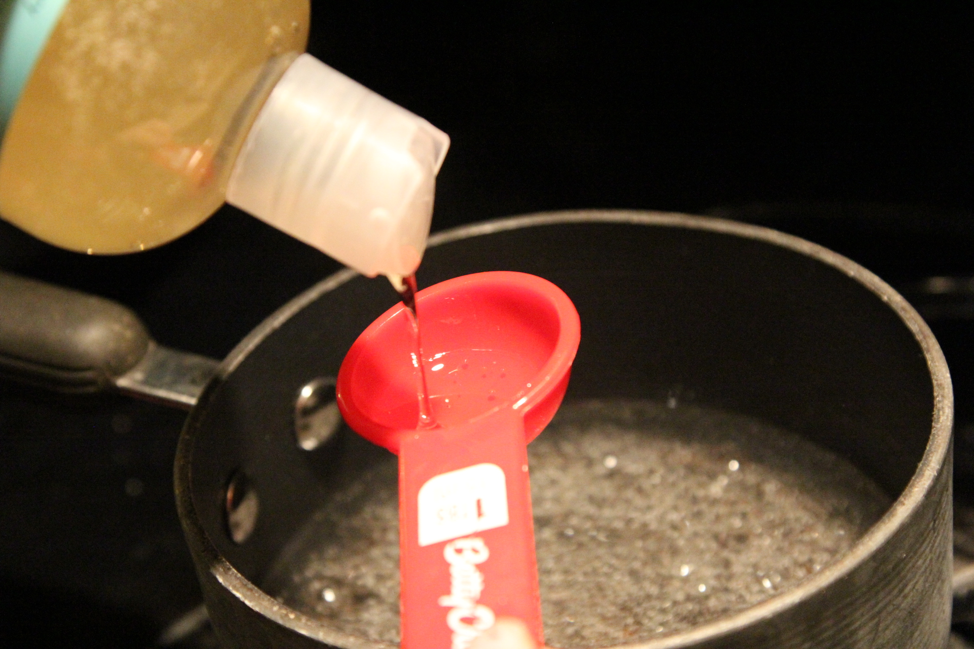 In a small pan, heat water on stove over low – medium heat. Add in Coconut Oil, liquid soap, and Tea Tree Oil. Stir to combine and once Coconut Oil is melted, remove from heat and allow to cool.