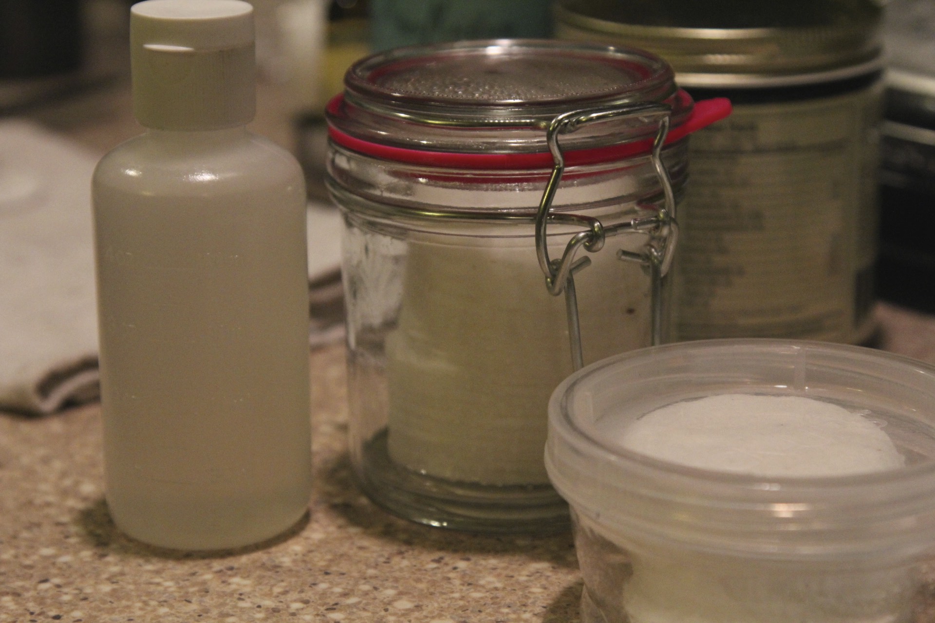 Containers – I found the squeeze bottle in the travel section of Meijer Health and Beauty department. You could wash an old beauty bottle or small lotion bottle that you have and use that. I found the glass jar in the home/kitchen area at Meijer. A mason jar would work nice, or an old jelly jar. Or if you want to stick with plastic, any plastic reusable container like Ziplock or whatever would work. You could also use a small cleaned sour cream or butter tub, anything that size as long as they have a lid. If you want to get all fancy, you could print out pretty little labels to hide your Daisy Sour Cream on the front.