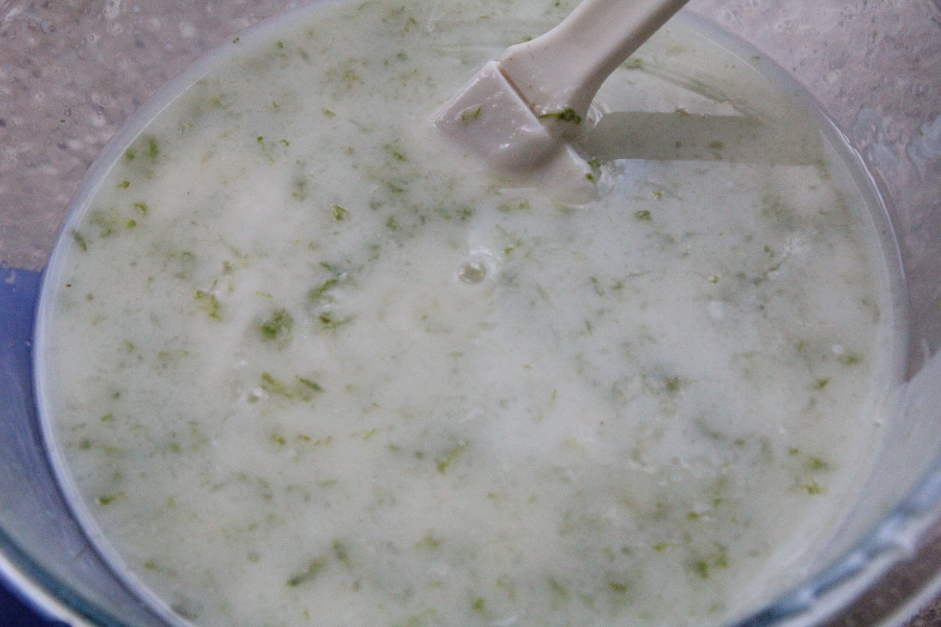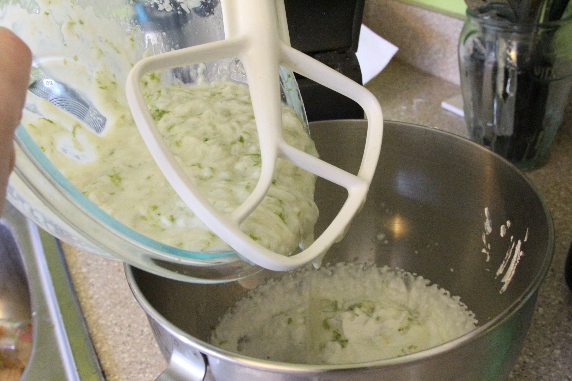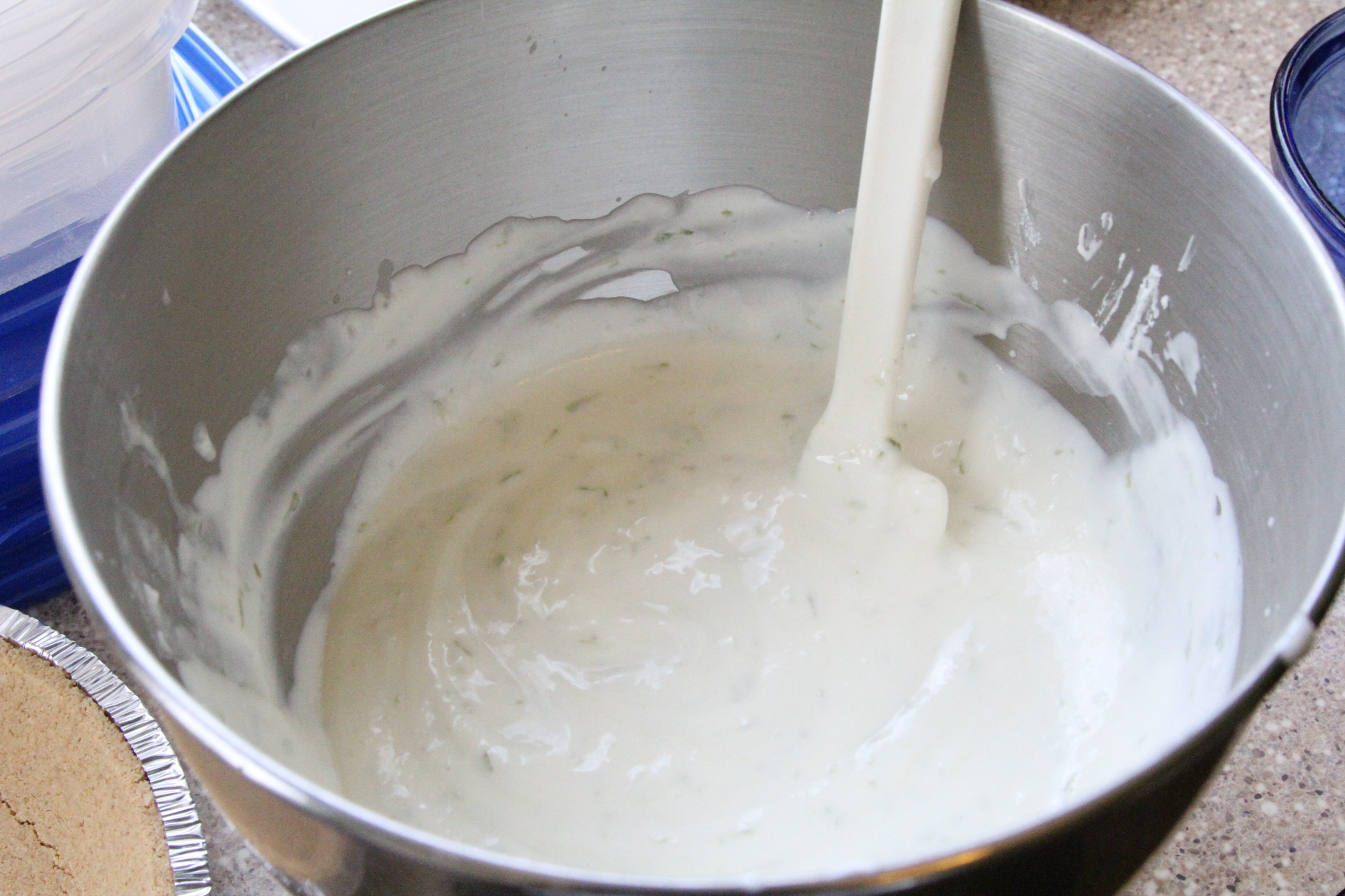 If using heavy whipping cream, take out your mixing bowl with whipped cream from fridge. Add the milk and lime juice and zest mixture to the whipped cream and mix just for a minute with the paddle attachment. You could also mix this by hand.