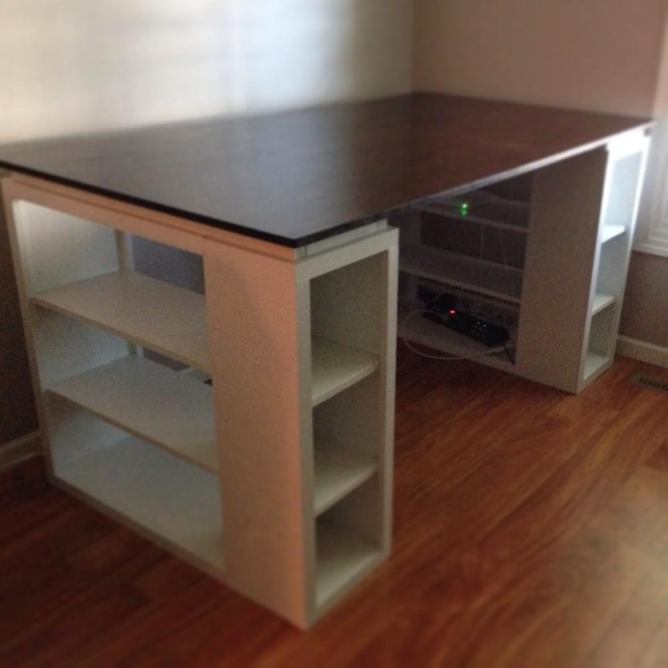 When we moved in, we brought along all our furniture since I can’t seem to let go of much. We had an antique desk that I had purchased several years back as our desk in our guest room in our old house so it became our full time desk in our current house. It’s a bit small for a family shared desk and lacks storage for all the clutter and stuff that you need in an office space. So we looked online and came across an idea for a craft table/desk on ana-white.com. If you’ve never stumbled across her website, I recommend it. It’s full of great ideas and very clear and understandable plans for those who may not be an expert (like us :)). We found plans to build the desk just as she did, bought all the wood and went ahead with it. Here are the plans if you are interested in making the craft table. It took a few weekends and days off to complete with the construction, sanding, painting and then sanding and staining the top. We were excited. This was going to solve our desk problems for sure. Plenty of shelving for media equipment, room for baskets to hide the desk clutter and plenty of room for the computer, multiple stools for the girls to sit and do homework or crafts. Taller desk height also meant we could stand or use stools which was neat.