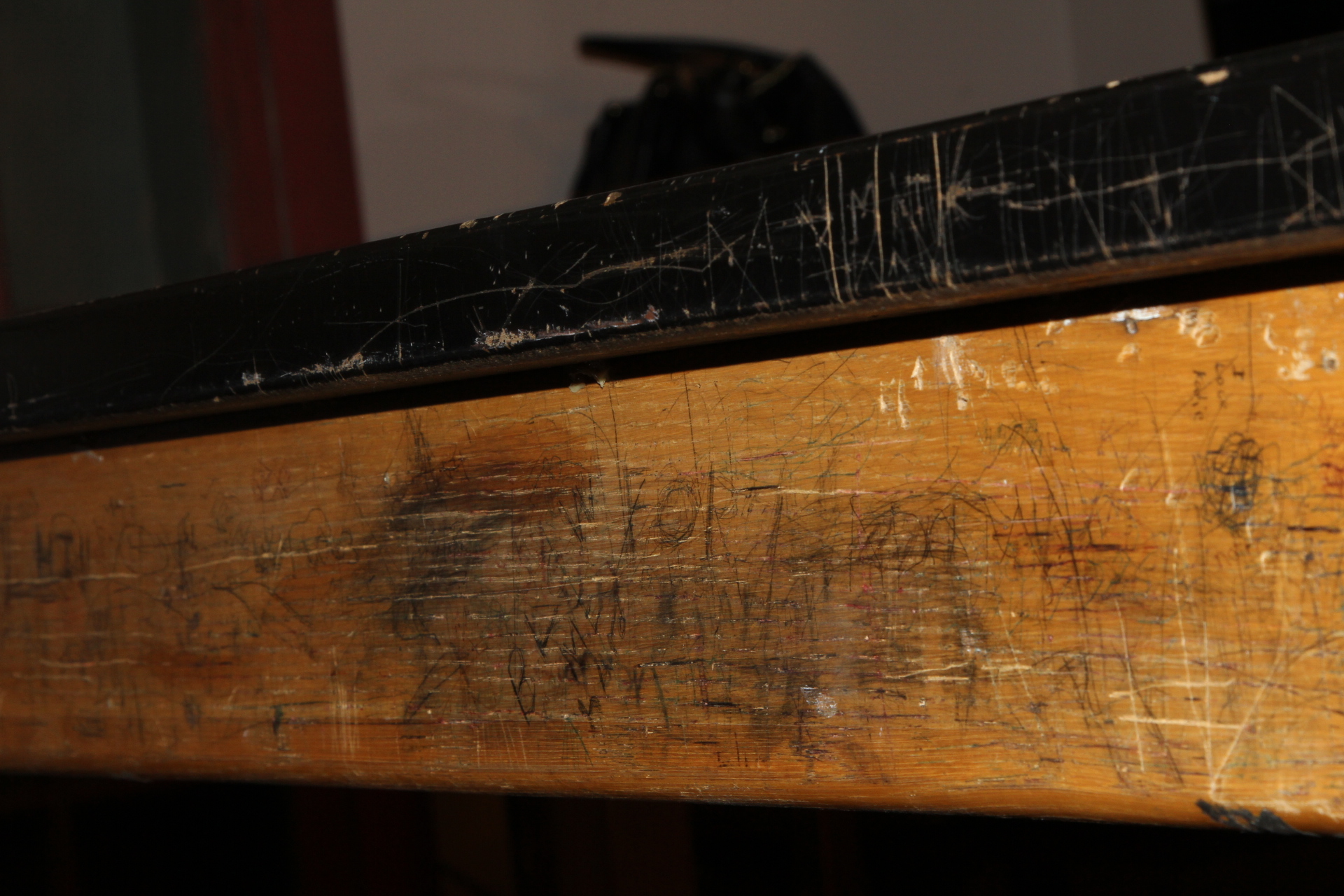 For over a year, we would look online at desk ideas. We thought about trying to build one again, but smaller and fit to our room’s size. I liked the idea of a built in look with shelves above for storage and worked with the window in our office area, but were concerned about future buyers of the house. Would they like the desk, would we have to remove it all and have a big mess when trying to sell our house. On a trip to one of my favorite antique stores Green Oak Antiques in Rochester IN, we hit the jackpot. They had this cabinet that I had seen posted a month or so prior when I thought for sure it had been sold by then. They reused an old window for the door, but constructed the shelves out of very sturdy wood and gave it an aged finish in a wonderful red that caught my eye the second I saw it. So we put our name on that little gem (it’s the red cabinet with the glass door in the pictures below) while we continued to look around. The antique store is over an hour away from where we live so when we go, we like to take our time. We make a few trips around the whole place, look in all the little nooks and rooms and their junk garden outside before we make our decisions and purchases and head home. They will hold onto purchased items if you don’t have room to take it home that day so we had them hold onto the cabinet for us. One of my favorite rooms in the place is called “The Rough Room.” It’s basically an outside room covered with a roof, but is full of the old, dusty pieces that need a little love or are perfect in their aged patina (depending on who’s looking at them). I saw this table sitting there, with a couple pieces of furniture piled on top of it and I liked the size of it. I liked the aged look and once I looked closer, I noticed it was an old science lab table from a high school or college. It had the bunsen burner holes, the scratches, the graffiti from students – it was perfect! I had to have it! I knew it would be a perfect desk and after hunting my husband down across the store, he agreed it was a great find. We negotiated the price and we were told it came out of an old science lab at Purdue University. That’s pretty darn cool. Takes me back to my high school science days for sure! I can’t help but wonder how many frogs and pig fetuses were dissected on this table!