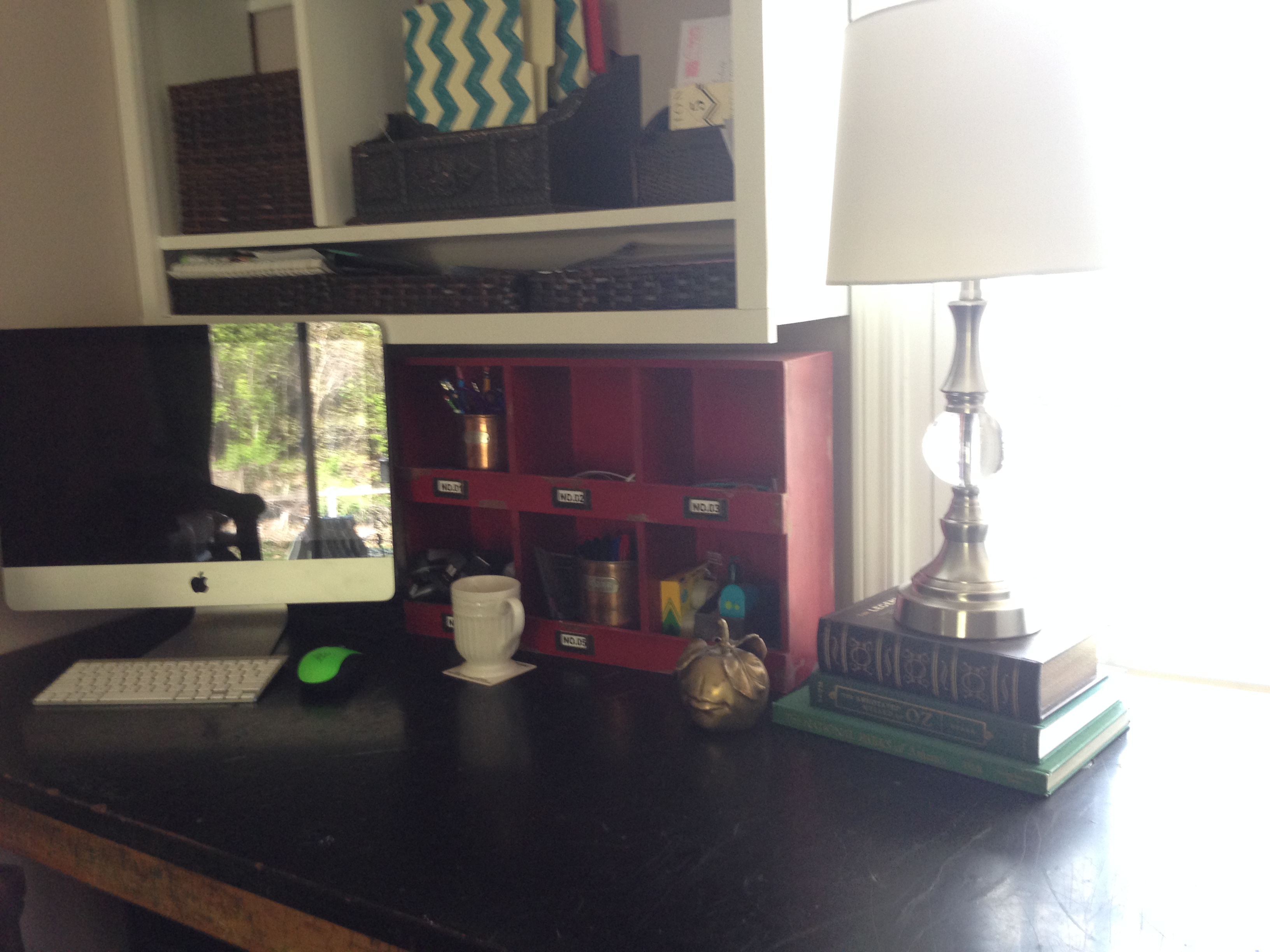 I found a red shelf with six cubbies to hold office supplies, keys, and all the other stuff that we seem to bring into the house.