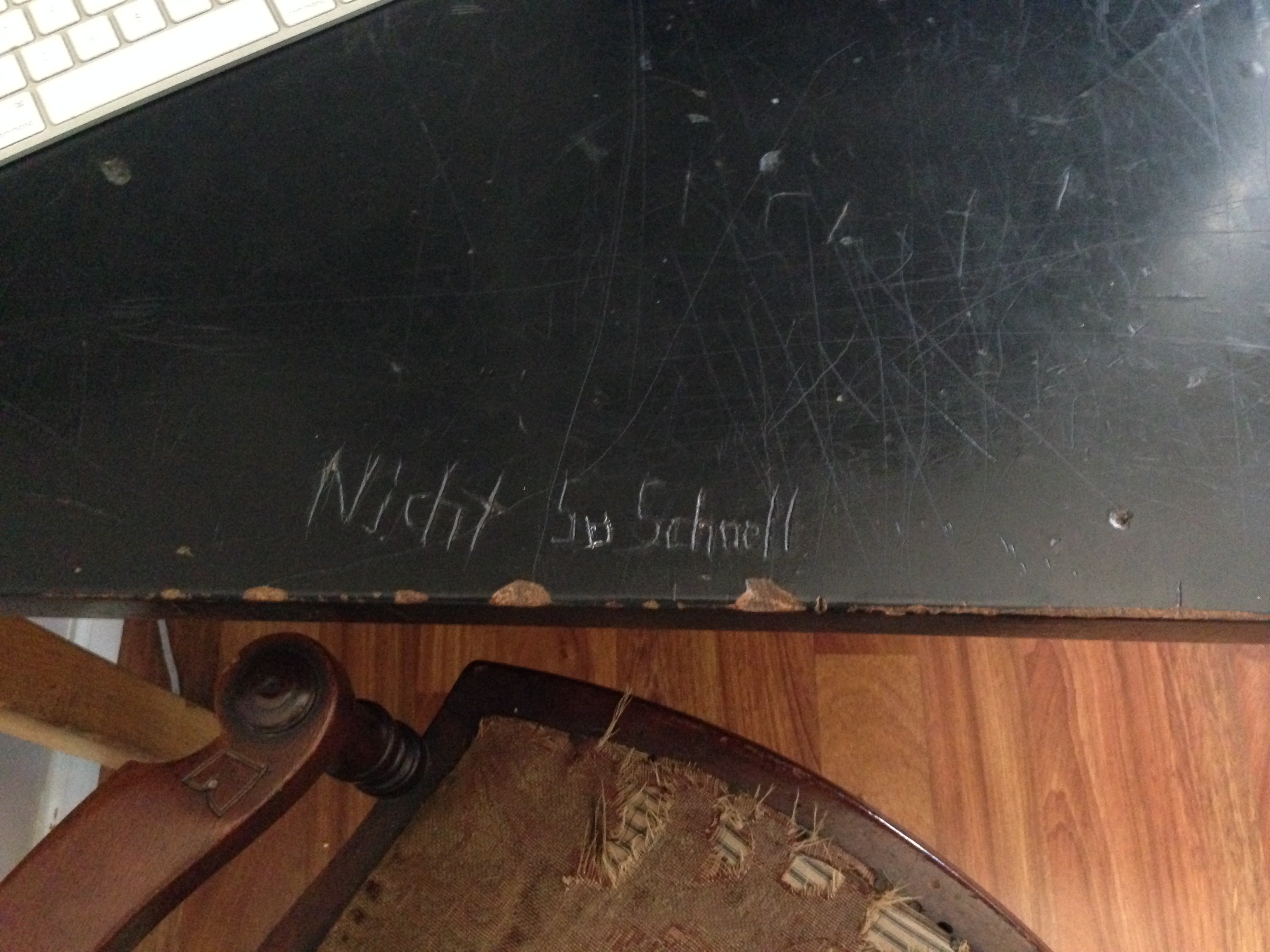 More details of the desk’s worn charm that I love. I’m not sure if they were trying to write in German or just really bad at spelling, but it’s entertaining either way.  “Nicht So Schnell” is carved into the table.  “Not so fast” is the German translation. Not so fast, buddy! Our old chair is in need of recovering but I can’t decide on what fabric to choose to honor the beauty and history of the chair. That will be another project!
