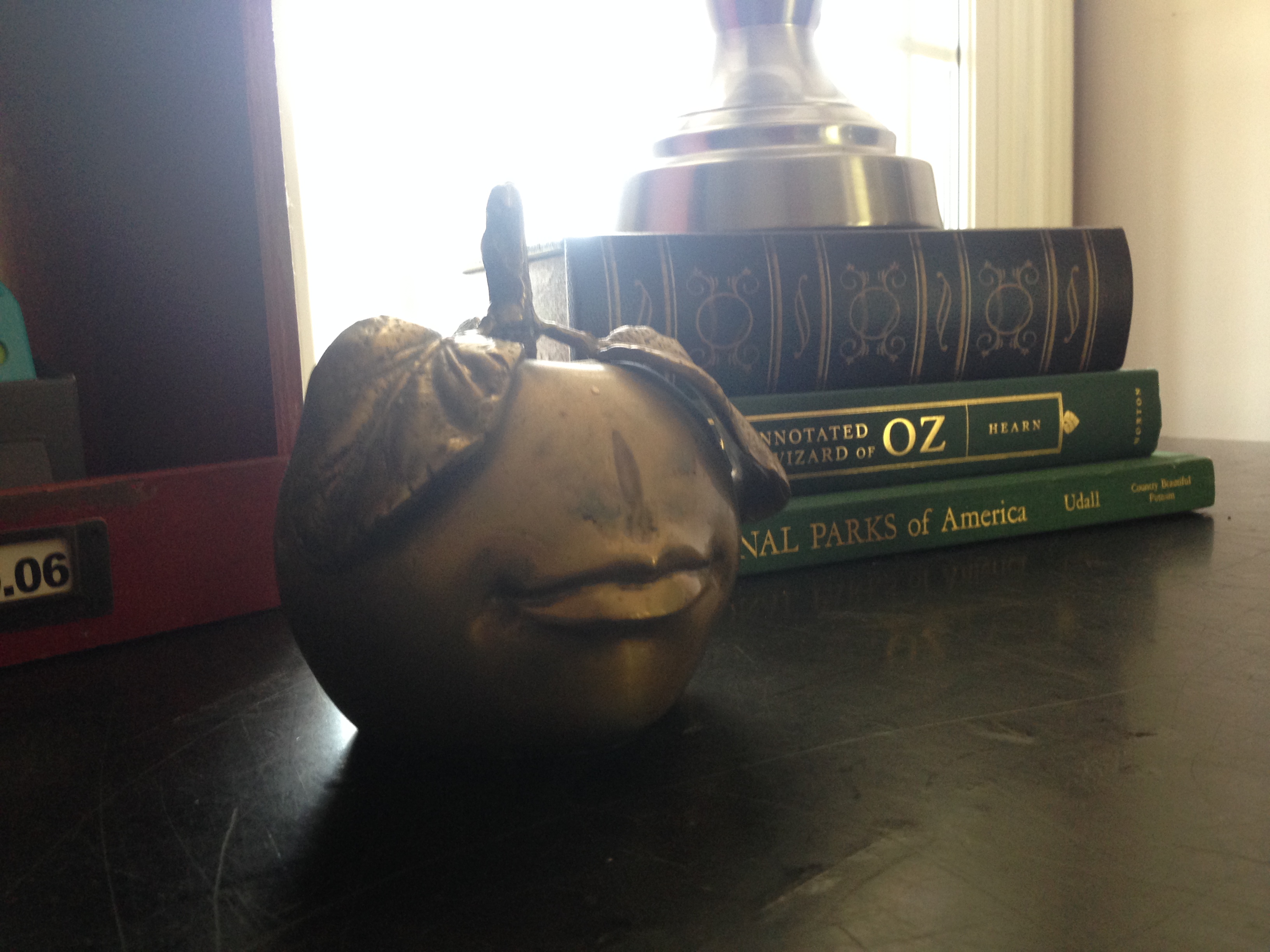 One of my favorite treasures. The creepy face bronze apple. My best friend bought it for me many years ago from the gift shop of the famous Stanley Hotel in Estes Park CO where Stephen King stayed and wrote The Shining.