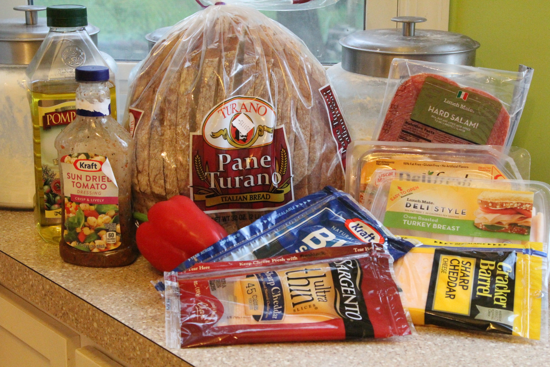 Turkey, salami, cheddar, mozzarella, red pepper with sun dried tomato dressing (as shown in the pictures)