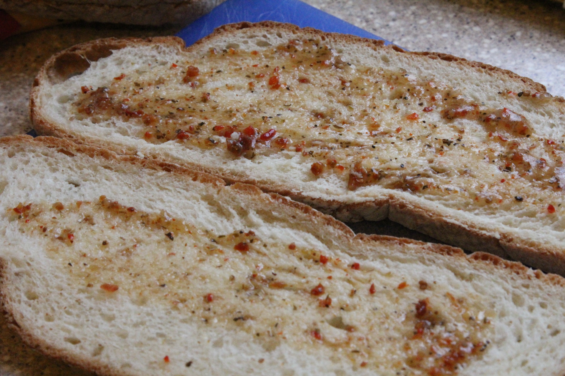 Spread on a little dressing or whatever sauce you like on the bread.