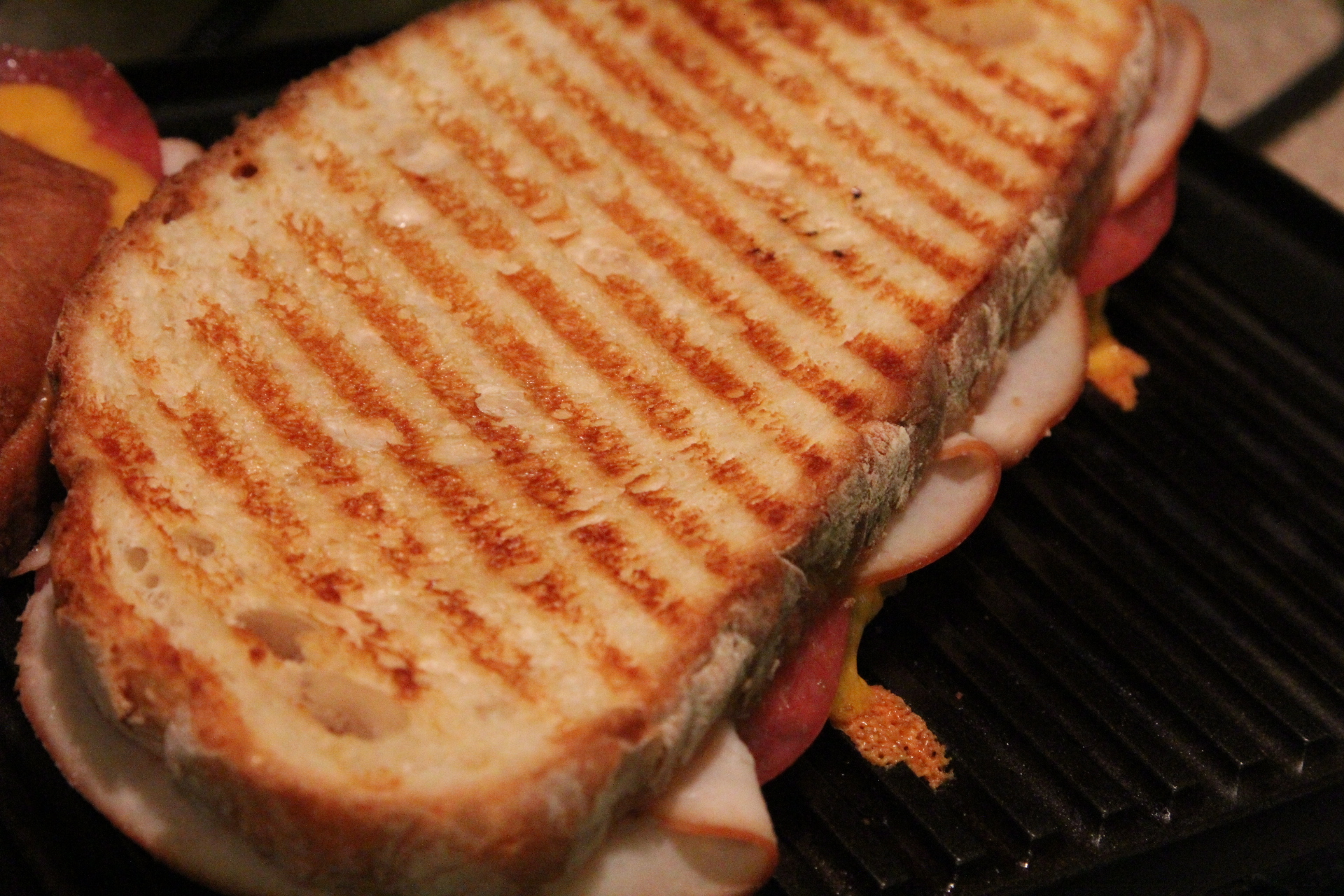 Heat Panini Press. If you don’t have one, you can use a large skillet and just weight the sandwich down with another pan to give it a little press.