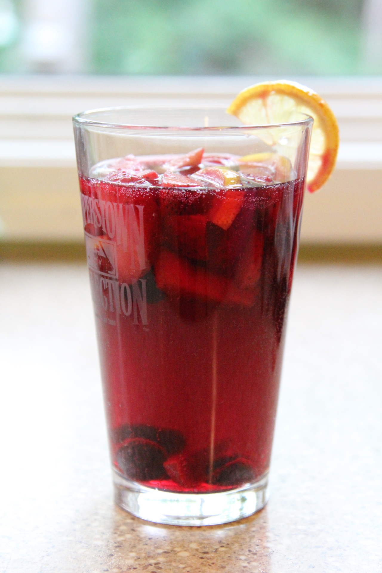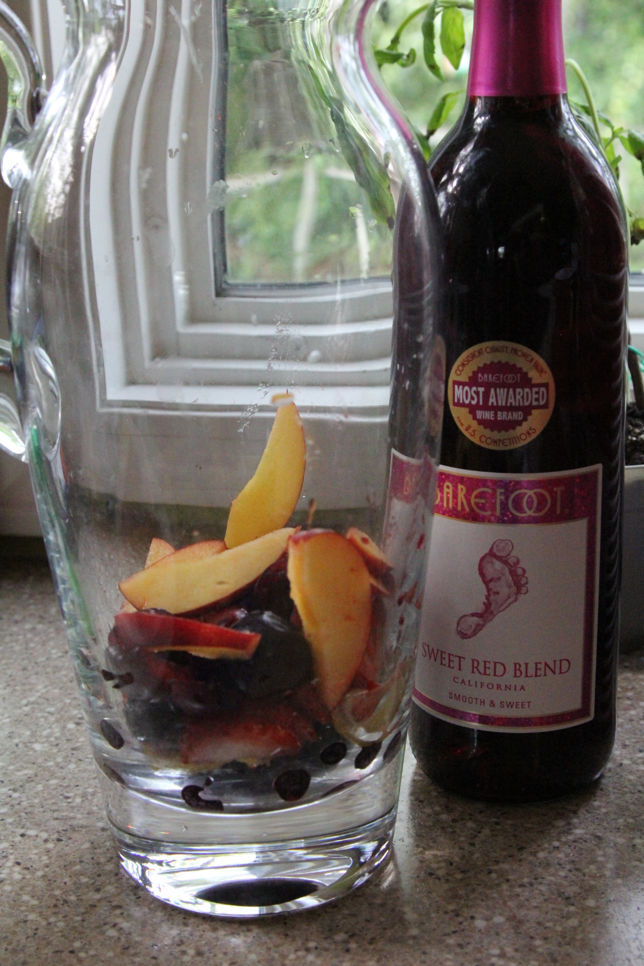 I decided to make my own sangria last weekend to go along with our Parking Lot Chicken. I’m not a big wine drinker at all. When I’m in the wine isle, I wish they had a category that was labeled “Newbie Wine.” It’s not that I don’t really like it, I just like it super sweet. No dry stuff please! And I prefer red over white. Same with grapes. I’ll pass on the green, but black and red are my favorite so I guess it makes sense that I’d prefer sweet red. I’ve bought bottles of sangria before and they were ok, but I wanted mine to be more fruity – as in fruit soaked in it and floating all through it and needing a spoon at the end to scoop out the fruit and enjoy. I wanted mine to be fizzy. Bottled Sangria lacks fizz so that’s a big downer for me. I searched Pinterest and found a few recipes that seemed on line with what I was looking for. As the check out lady checked my ID at the grocery store, scanning my items, I told her about my plans to make sangria and how excited I was to make it. I do love the grocery store!