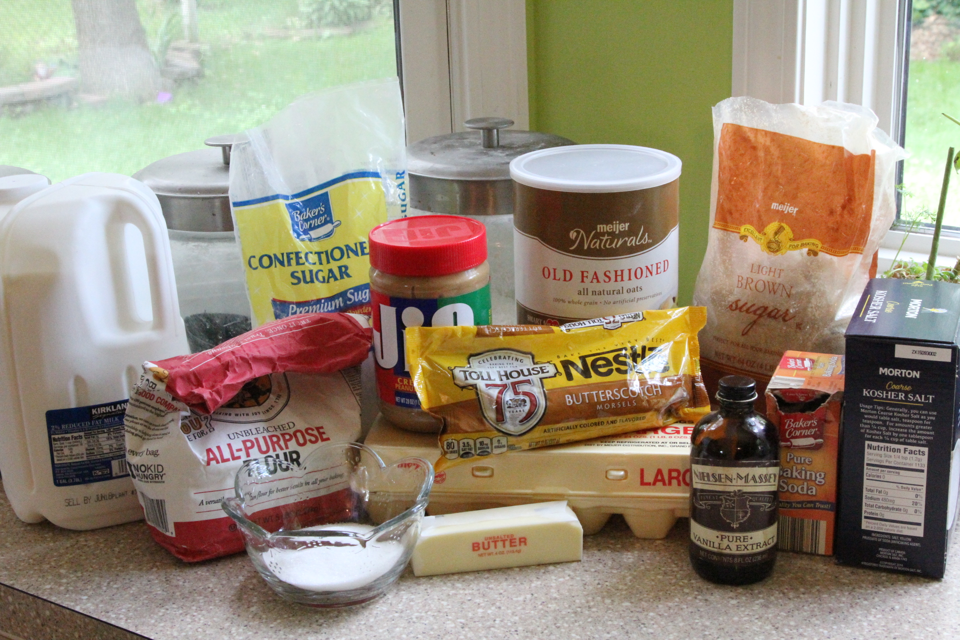 Yesterday was my husband’s birthday. He’s not a huge dessert lover and can pass up ice cream most of the time, as opposed me. I swear it beckons me every time I open the freezer. And he could care less about chocolate. He does have a few weaknesses in the sweet category so I usually try to go for one of those for his birthday. Those are peanut butter, peanut butter cups, Butterfingers, caramel, and butterscotch. Last year, I made him a frozen peanut butter cup pie topped with chopped peanut butter cups. It was divine. This year, I opted to go for a butterscotch and peanut butter combo that I knew he would love. This recipe comes from Trisha Yearwood, I didn’t change it one bit. So give her the credit for the tasty creation! You can see her recipe here. The only slight change I made to her original recipe was the oats. I used old-fashioned oats instead of quick cooking because that all I tend to have on hand. My pan was a kind of odd sized so I made 1 and a half of the recipe because I wanted them to have a little thickness. This worked out perfect. They are quick to throw together and definitely satisfy that craving for peanut butter. Most of the ingredients are basic pantry staples that you have just waiting to be used for a special treat! The only thing I had to sneak and purchase while we were together at the store was the butterscotch chips. You could swap out the butterscotch chips for chocolate, heath bar chips, or whatever you like. If you want a little more crunch and saltiness to the bar, you could add a few chopped pretzels to the batter. You could also increase the chips of your choice and throw some in the batter mix, as well as just sprinkled on top of the bars like in the recipe.