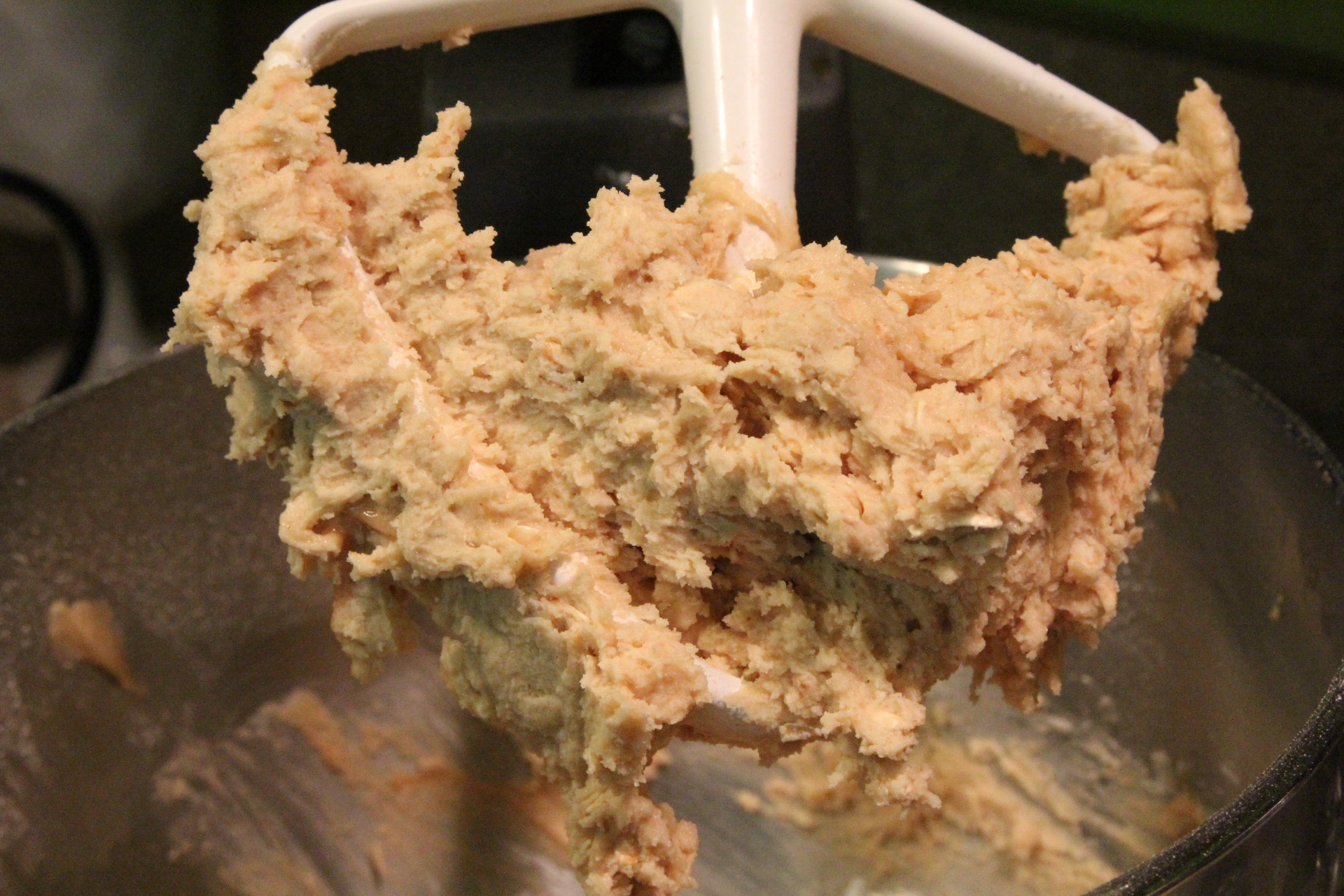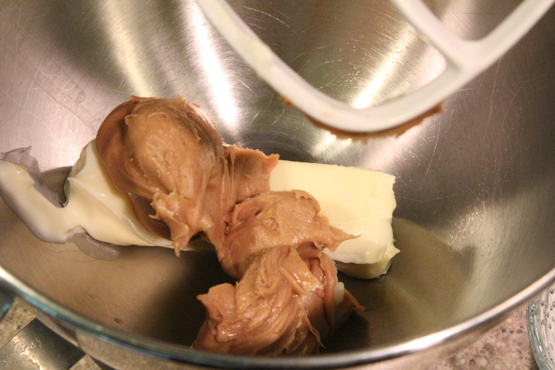 Using either a stand mixer or hand mixer, combine the softened butter, brown sugar, granulated sugar, and peanut butter.