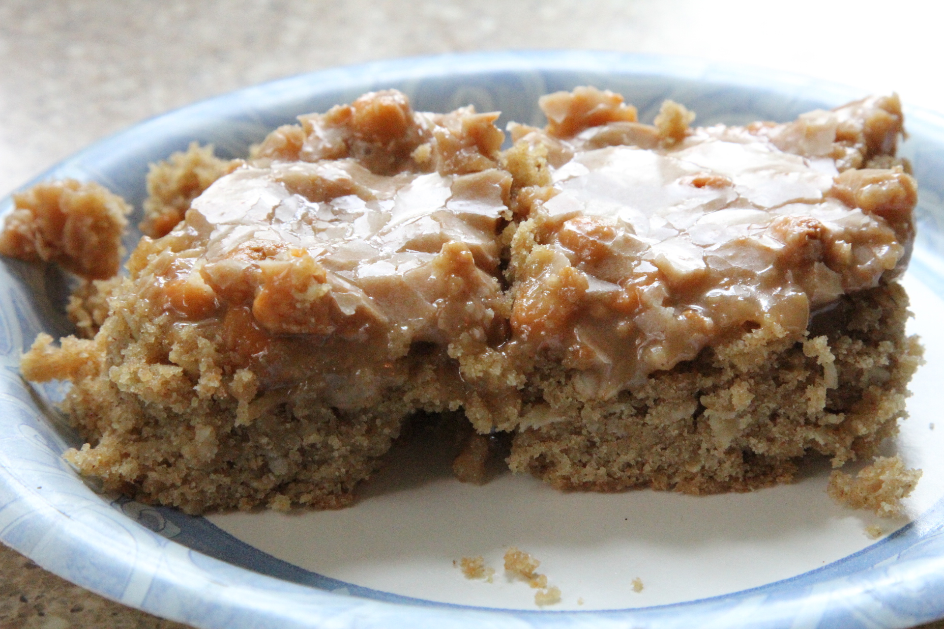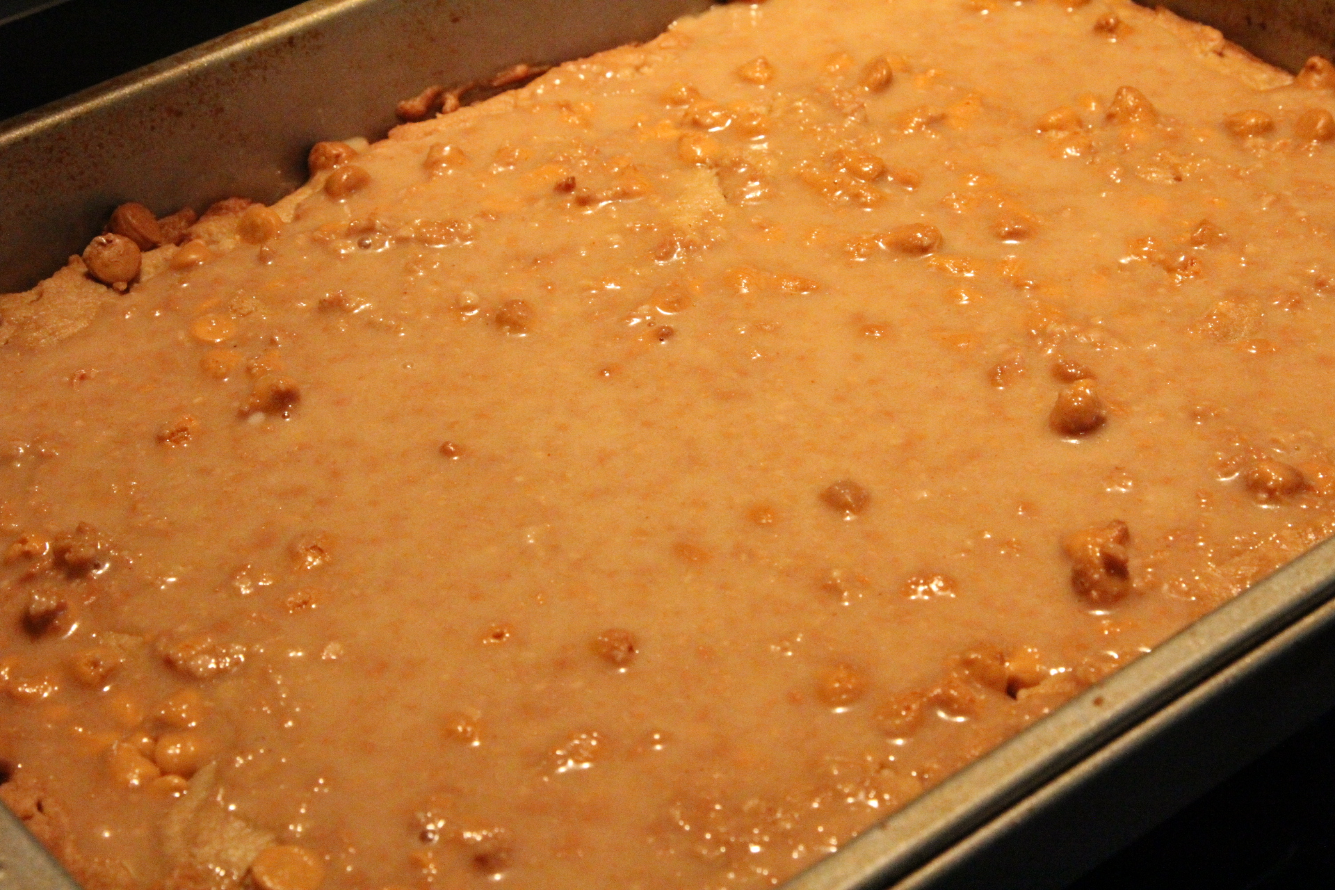 I let the bars cool for around 10 minutes before pouring the glaze on. They were still warm, but not too hot that they just soaked up all the glaze. Spread the glaze evenly over the bars.