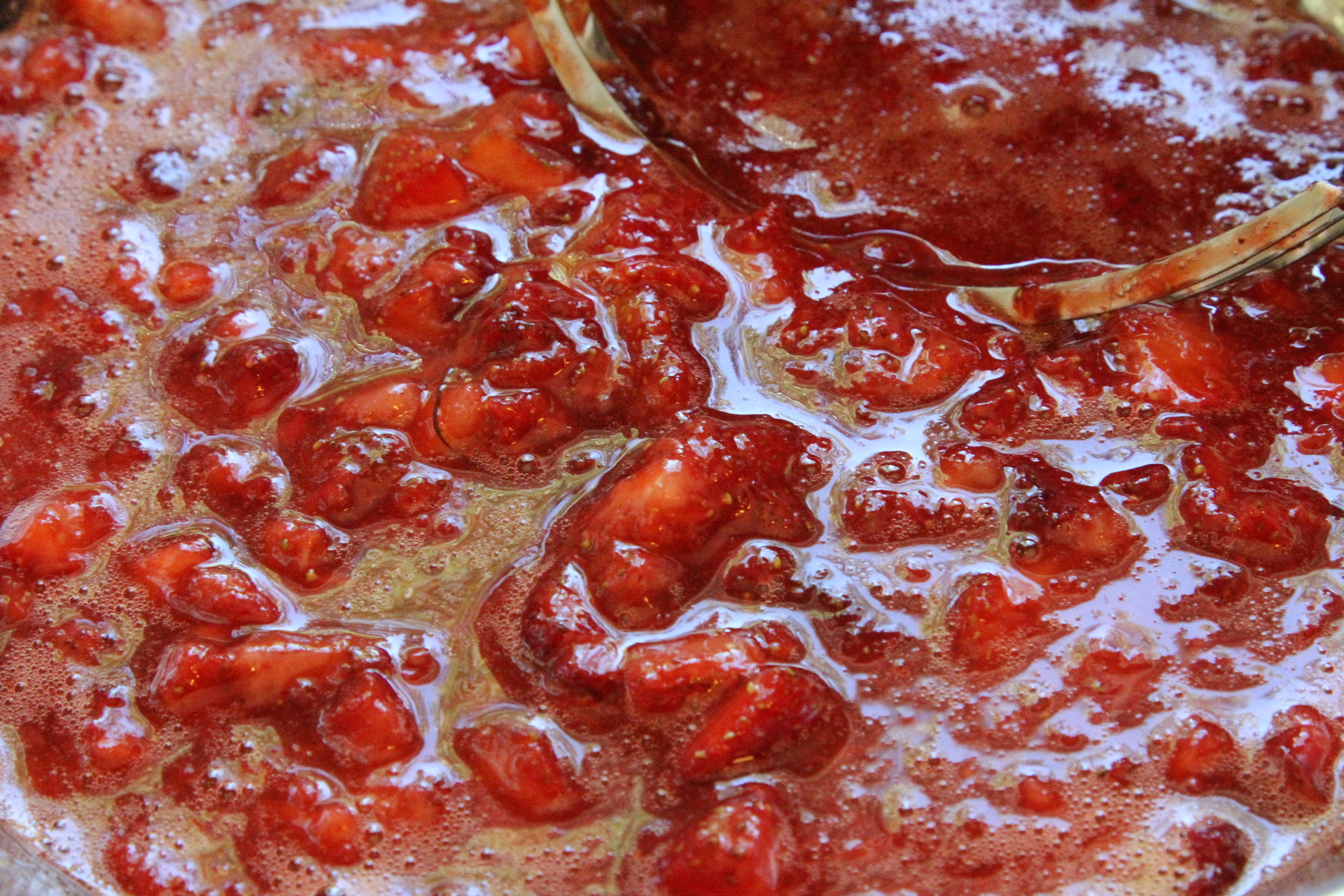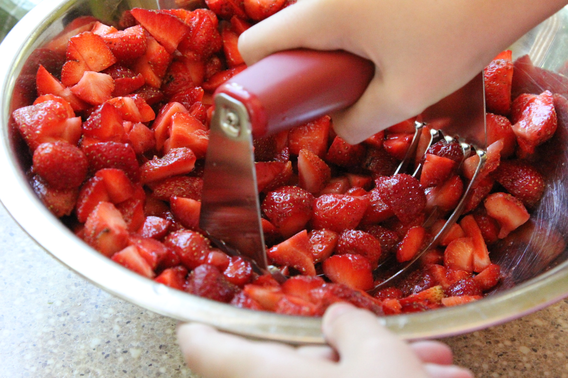 In a large bowl, combine the remaining 4 C of strawberries and 3/4 C of sugar. Mash this with a pastry cutter, potato masher or fork until the strawberries are nice and juicy and have only small chunks.