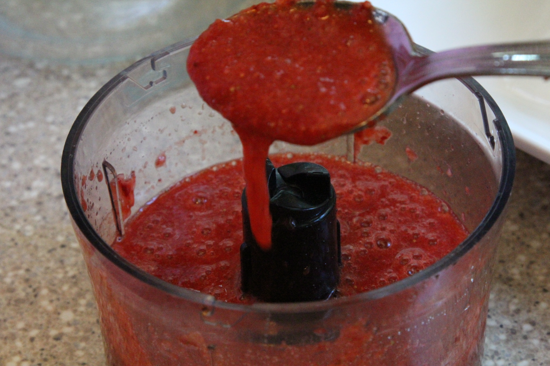 In the meantime, add the reserved cup of strawberries and sugar to a food processor and pulse until smooth.