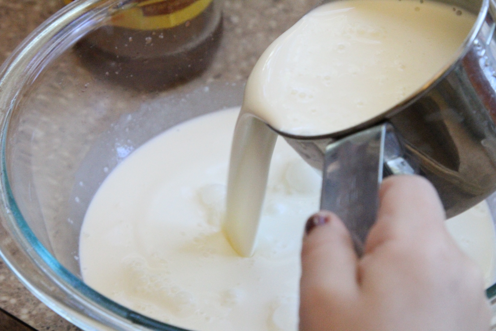Pour the egg and cream mixture into the large bowl of mashed strawberries.