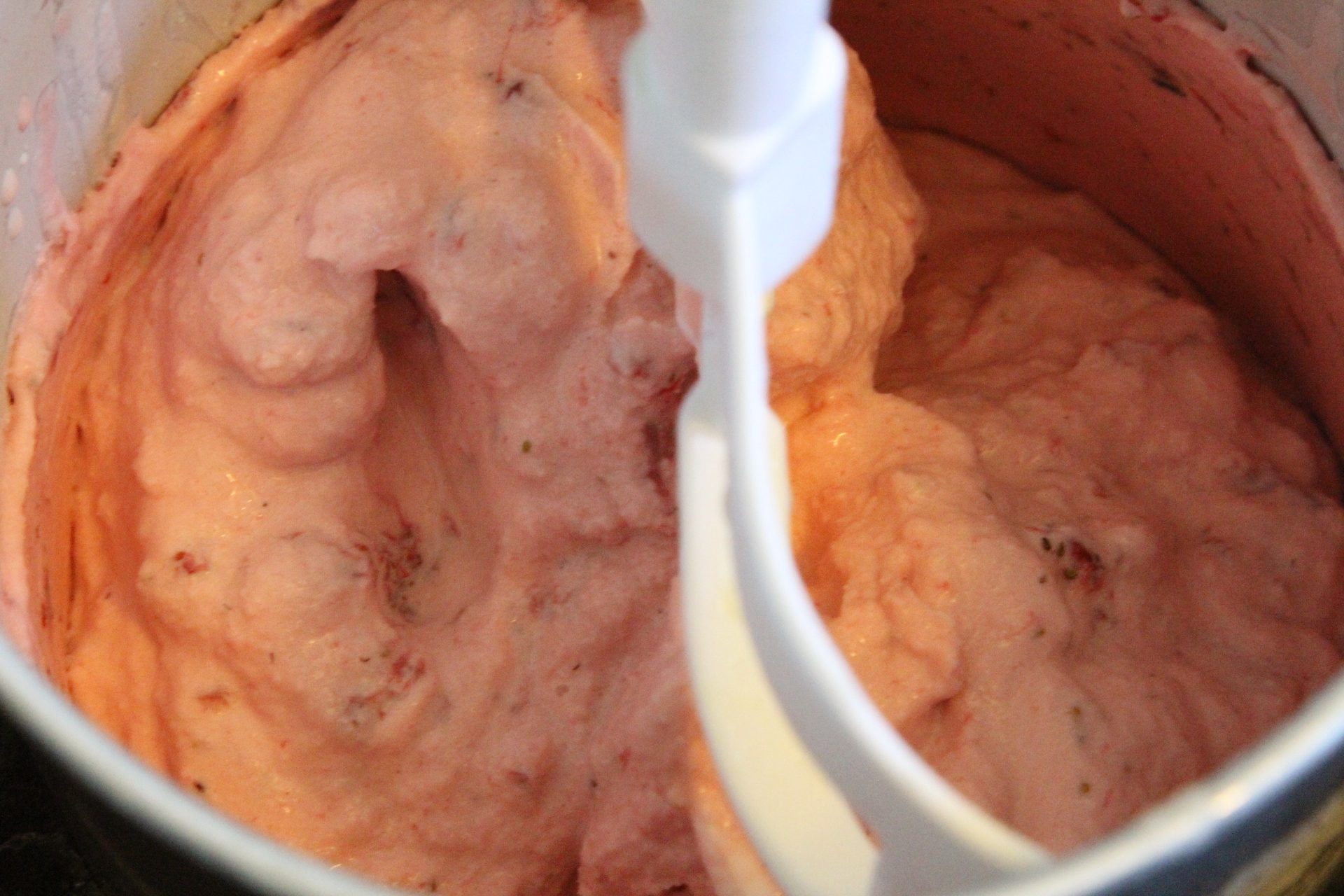 Pour this puree into the ice cream canister and churn for another 2-3 minutes until the puree is ribboned into the ice cream. You can also do this by hand if needed, either in the canister or in the container you transfer the ice cream into.