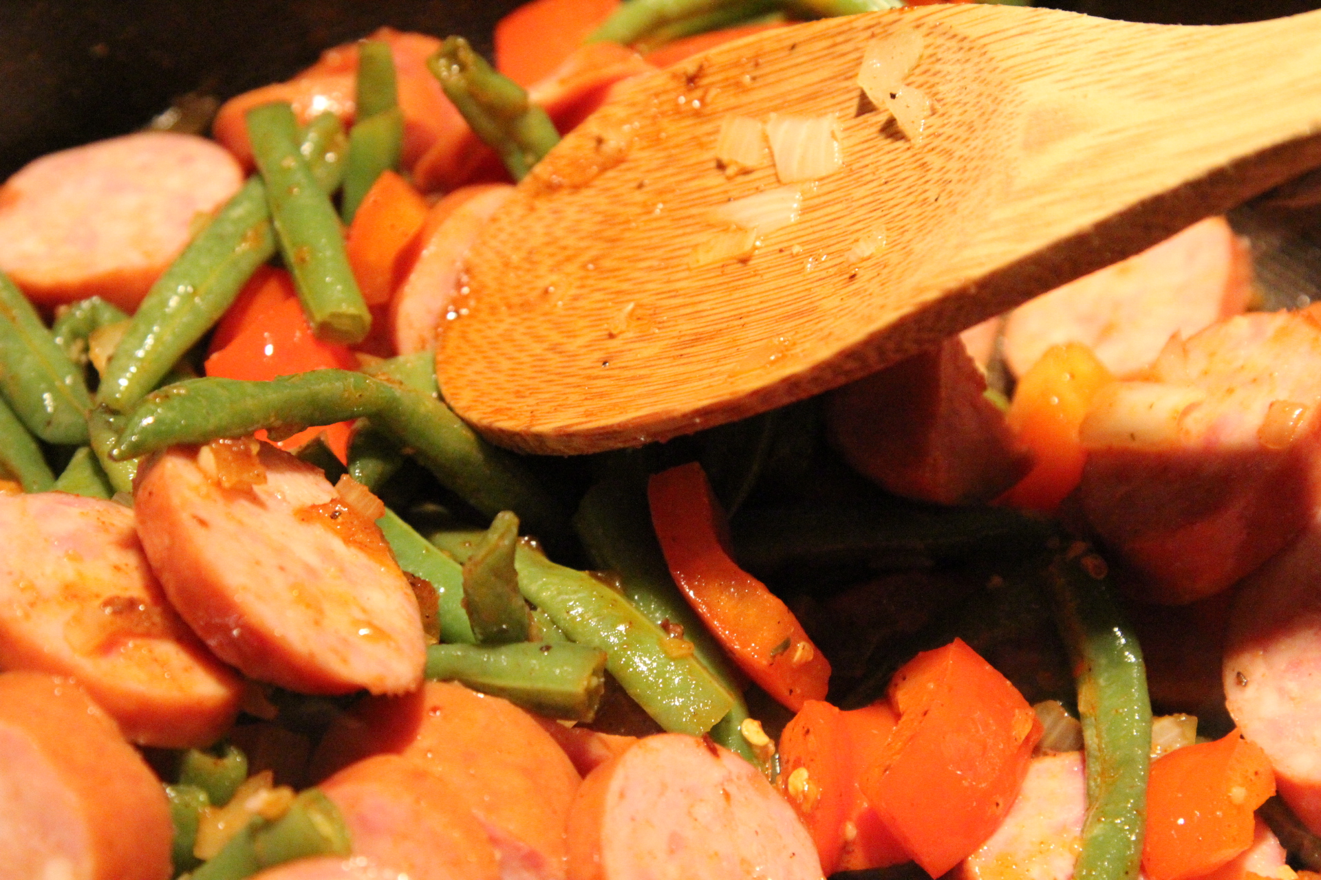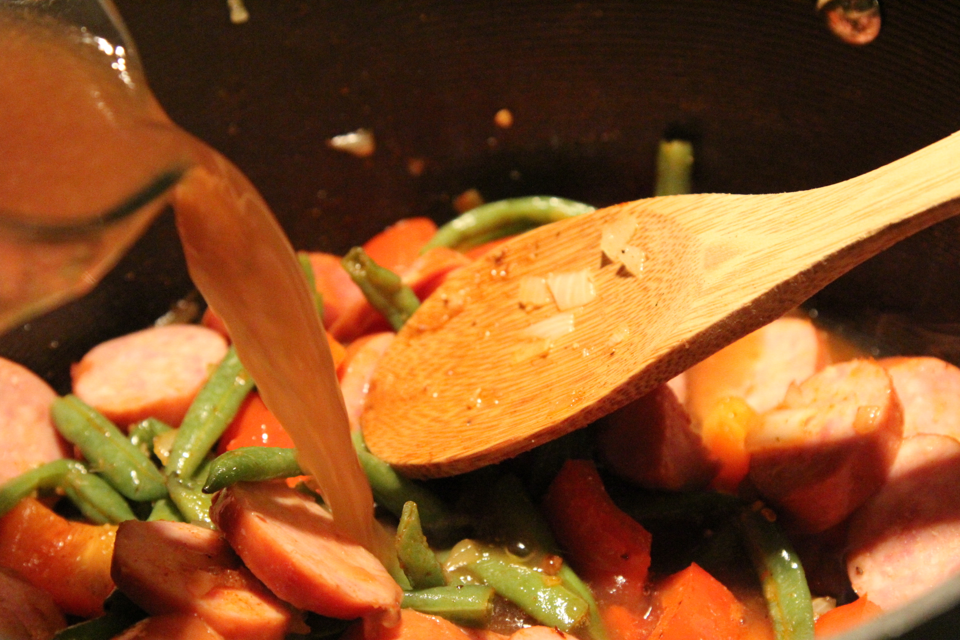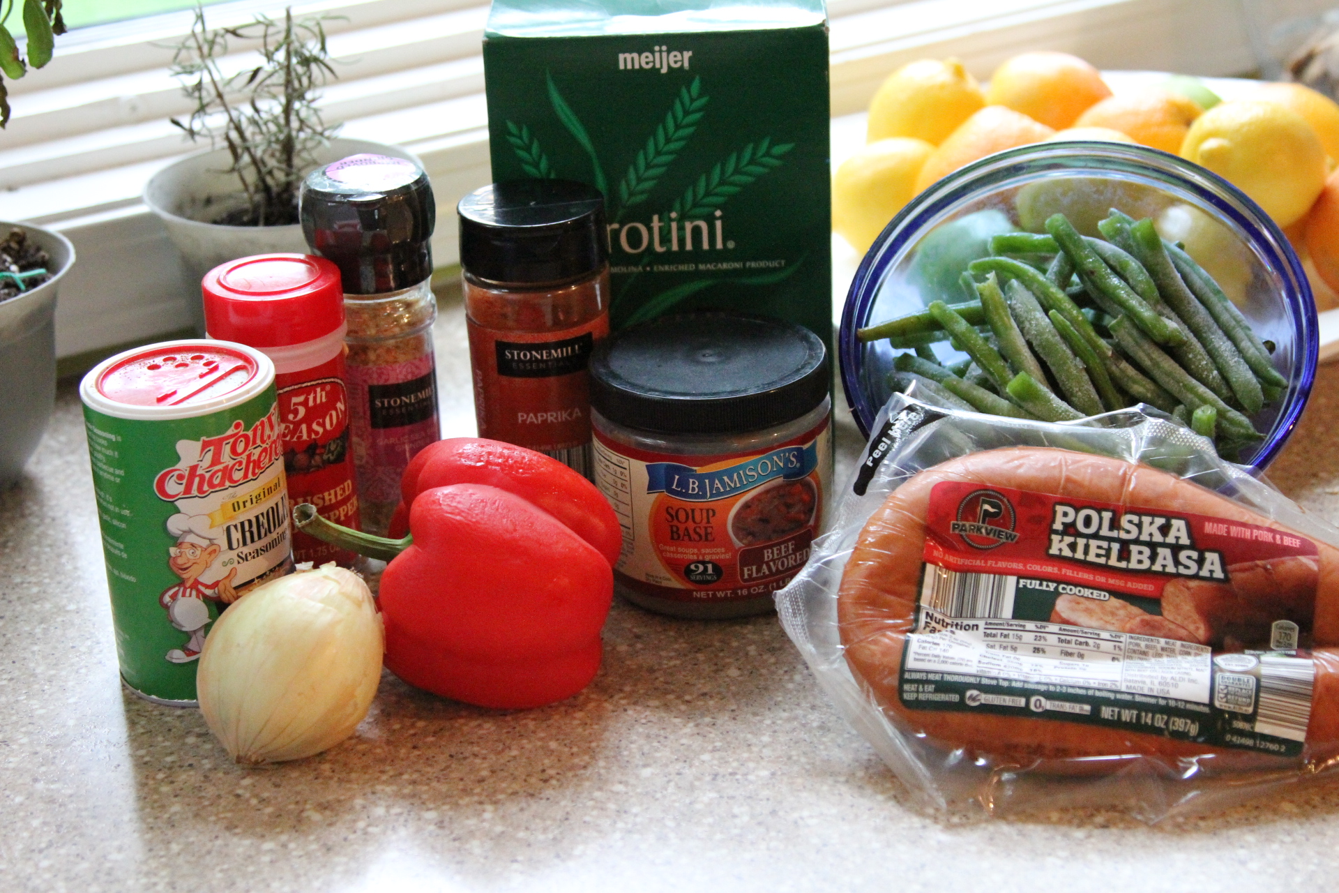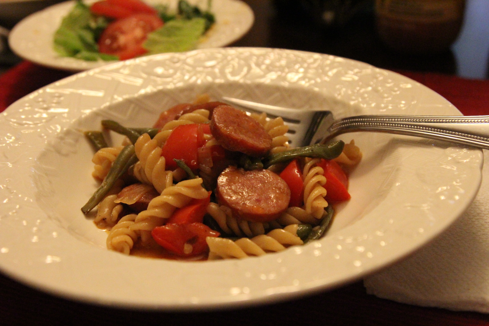 I remember when I was little sometimes while flipping through the channels on the TV, we’d come across this older man in usually a denim shirt that carried a very strong Cajun accent. His little stories, jokes, and laughter sucked us in most times and we ended up watching the remainder of his show. This Cajun chef was Justin Wilson. Sadly, he passed away several years ago. If you have never heard of him, look him up so you don’t miss out! I can’t wait to make some gumbo when fall comes around. I’m sure I’ll be trying to imitate him as I am making it, saying “I ga-ron-tee you gonna like this!” This Cajun Pasta dish inspired by the flavors of great Cajun cooking and is a quick throw together meal. You can easily swap out whatever veggies you like and add in different proteins if you like. You could serve this over rice to be like a quick gumbo, serve it with pasta like I did, or serve without any starch and double the beef broth to be more like a soup. It’s full of flavor and very versatile so give it a try!