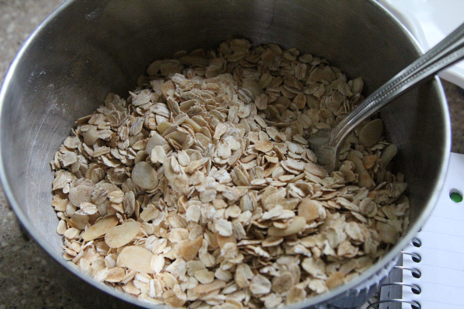 Combine oats, cinnamon, 1/2 C almonds, baking powder, and salt together and set aside.