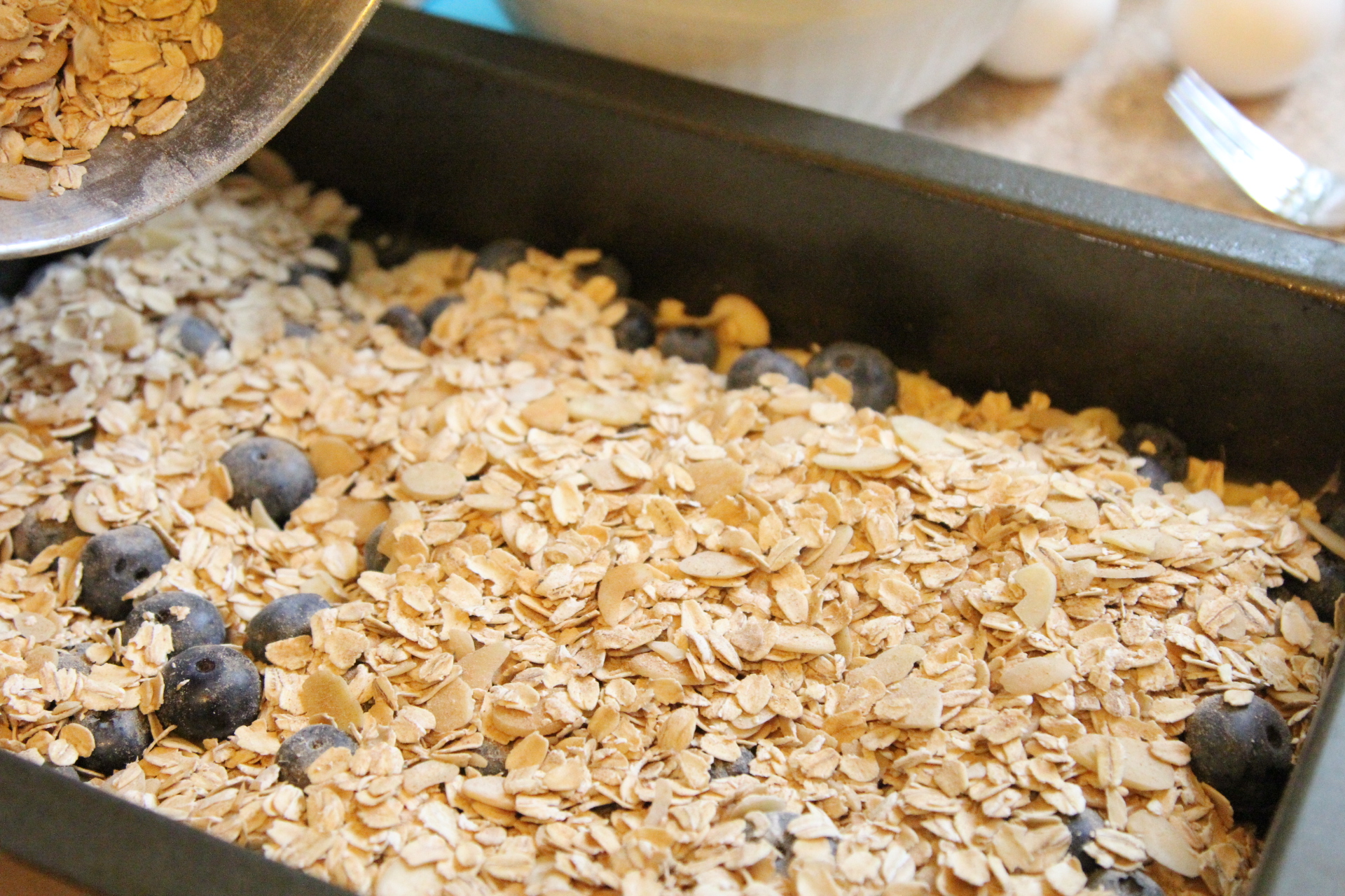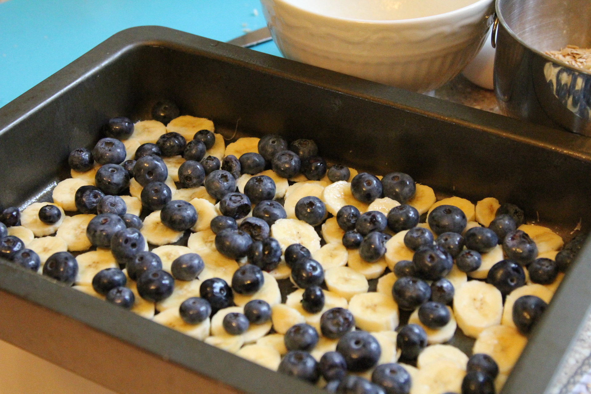 Add a layer of blueberries or whatever fruit you are using but save 1/2 of the fruit for the top.