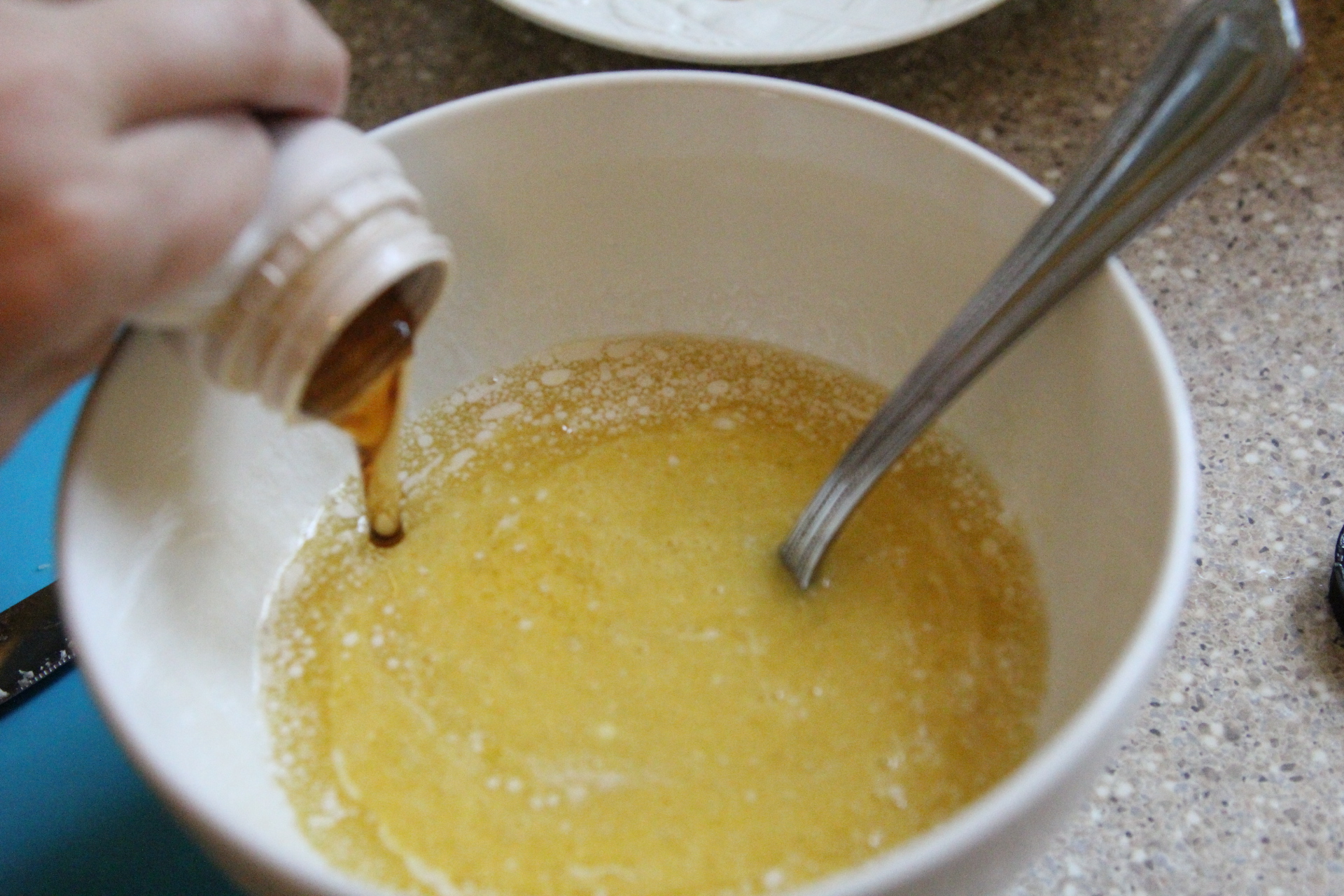 In a small bowl, combine maple syrup, beaten eggs, milk, melted butter and vanilla. Whisk until combined.
