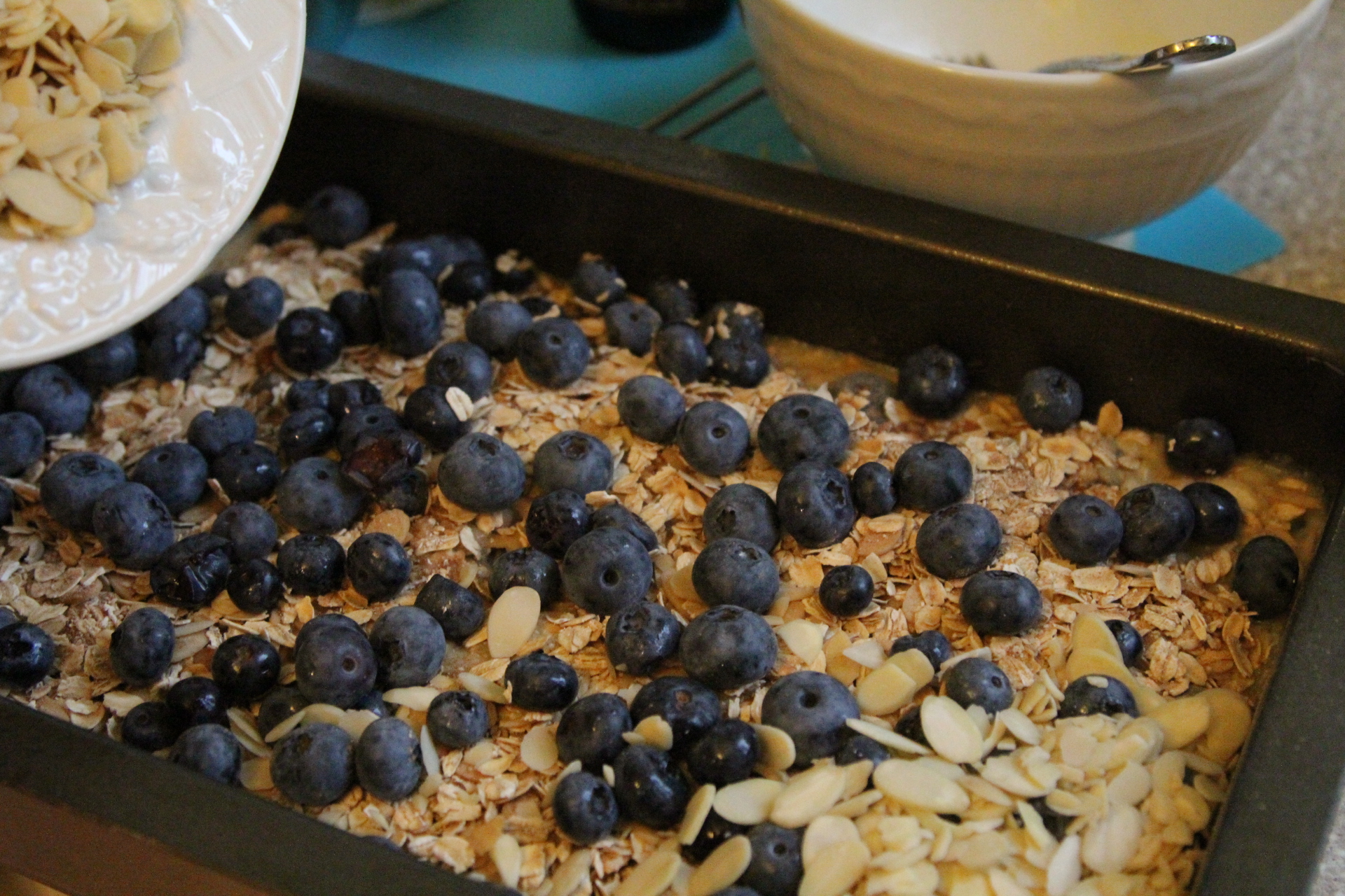 I found another use for all those wonderful blueberries we picked a few weeks ago. When I drive by the orchard, they have signs up saying blueberries are still available for picking. I am tempted every time to stop by and pick just a few more pounds! But my freezer is full and I just don’t have any more room! I’ve started a savings fund to buy a second chest freezer! This recipe is a great way to use up whatever fruit you like, plus the added stick to your ribs goodness of old-fashioned oats! I love oatmeal. I remember as a kid, sitting at the breakfast table not wanting to eat it. That way long before the maple brown sugar, apple cinnamon flavors were available. My dad just made us plain old oatmeal. No thanks! I like it mixed with fruit, syrup, and all kinds of goodies to make it not so boring and not so healthy, well sorta! This one isn’t too bad on the naughty ingredients and it makes a big 9×13 sized dish full so if you do the math, it really isn’t that bad at all. You can use any type of fruit you like and any type or no nuts. I love the crunch of the almonds but I know some are not nuts over nuts as me, so just adjust to your liking. This is so good because you can bake it in the oven and keep it in the fridge for up to 5 days. So you can make it on the weekend and then throughout the week, just scoop out your serving in the morning, and heat it up in the microwave for a minute. You instantly have a great homemade breakfast that will warm you up and keep you going. That beats the boring box of cereal on those busy school mornings! It’s so good, you could even use it as a dessert. Call it baked oatmeal, call it a crisp. Whatever it is, I loved it!