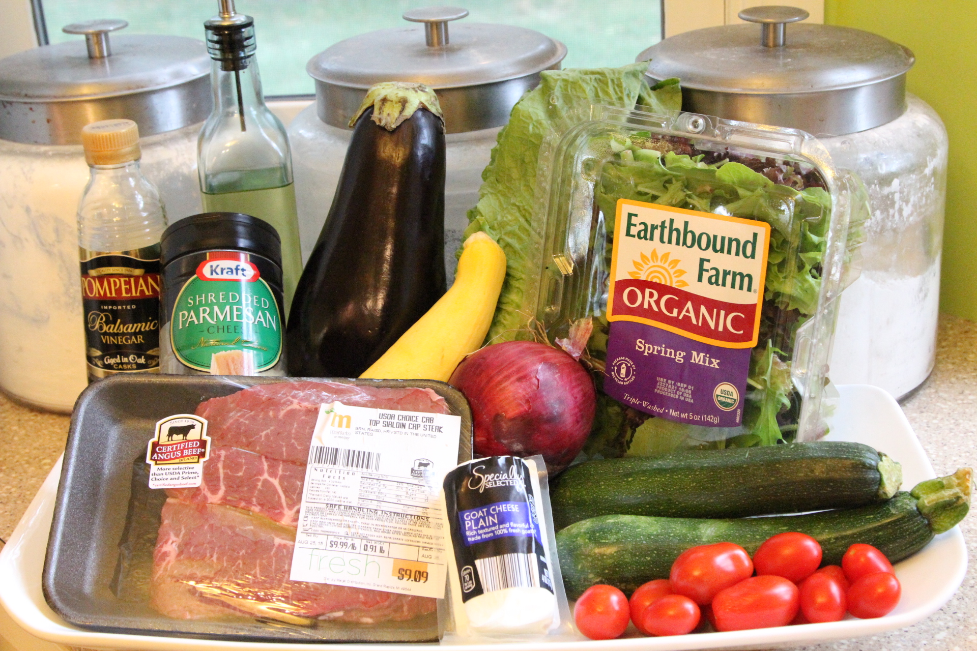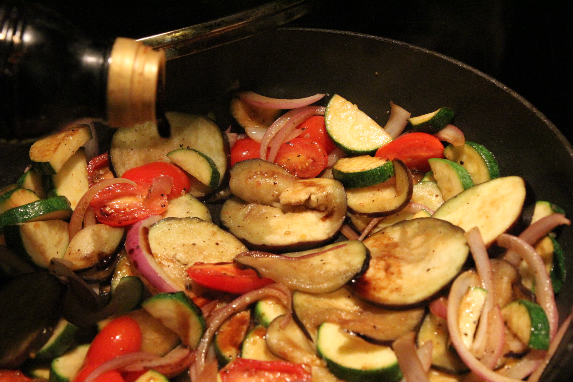 Veggies of your choice. I used Eggplant, Zucchini, Grape Tomatoes, and Red Onion. I think the red onion goes perfectly with the balsamic, BTW. I decided not to use the yellow squash shown in the picture