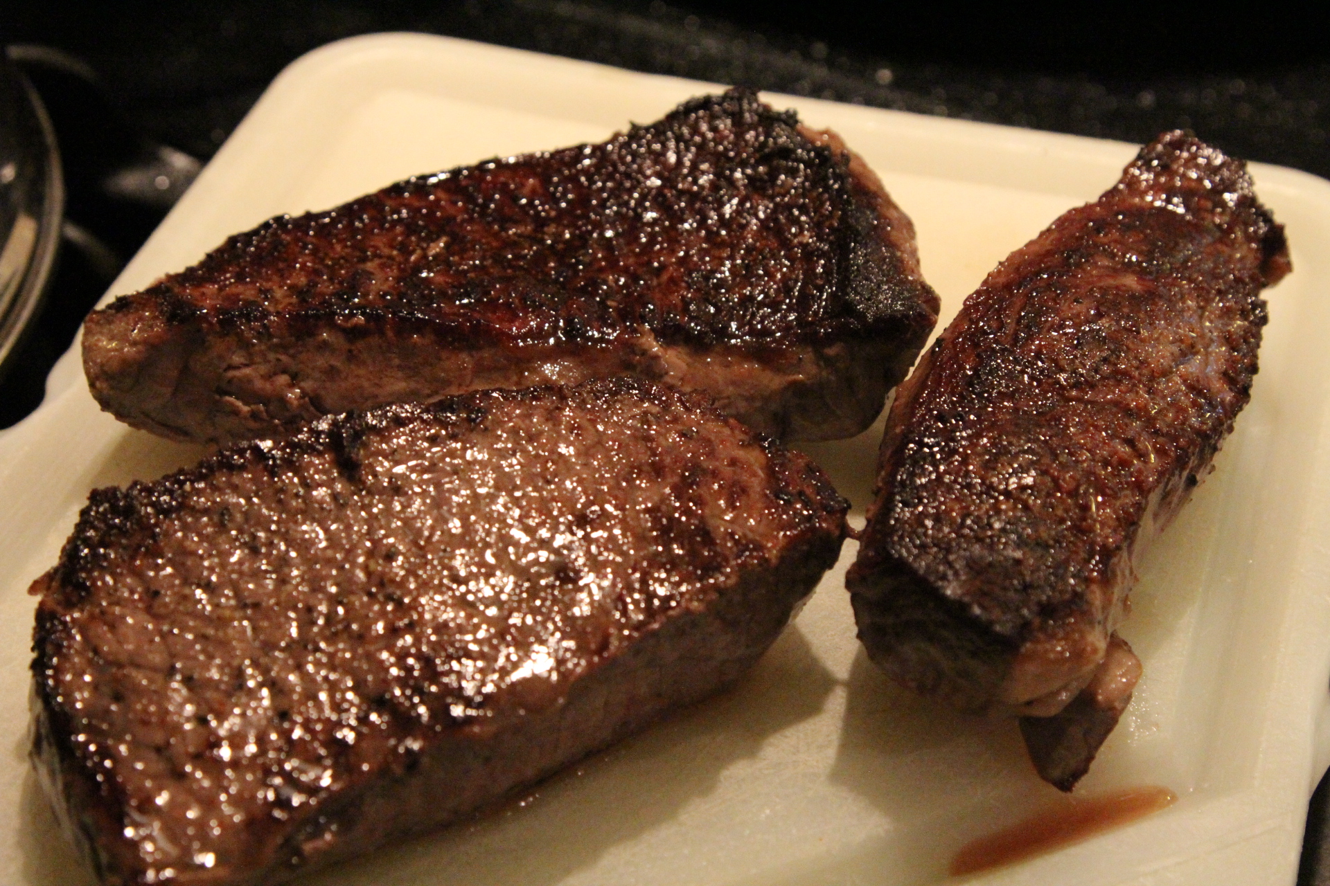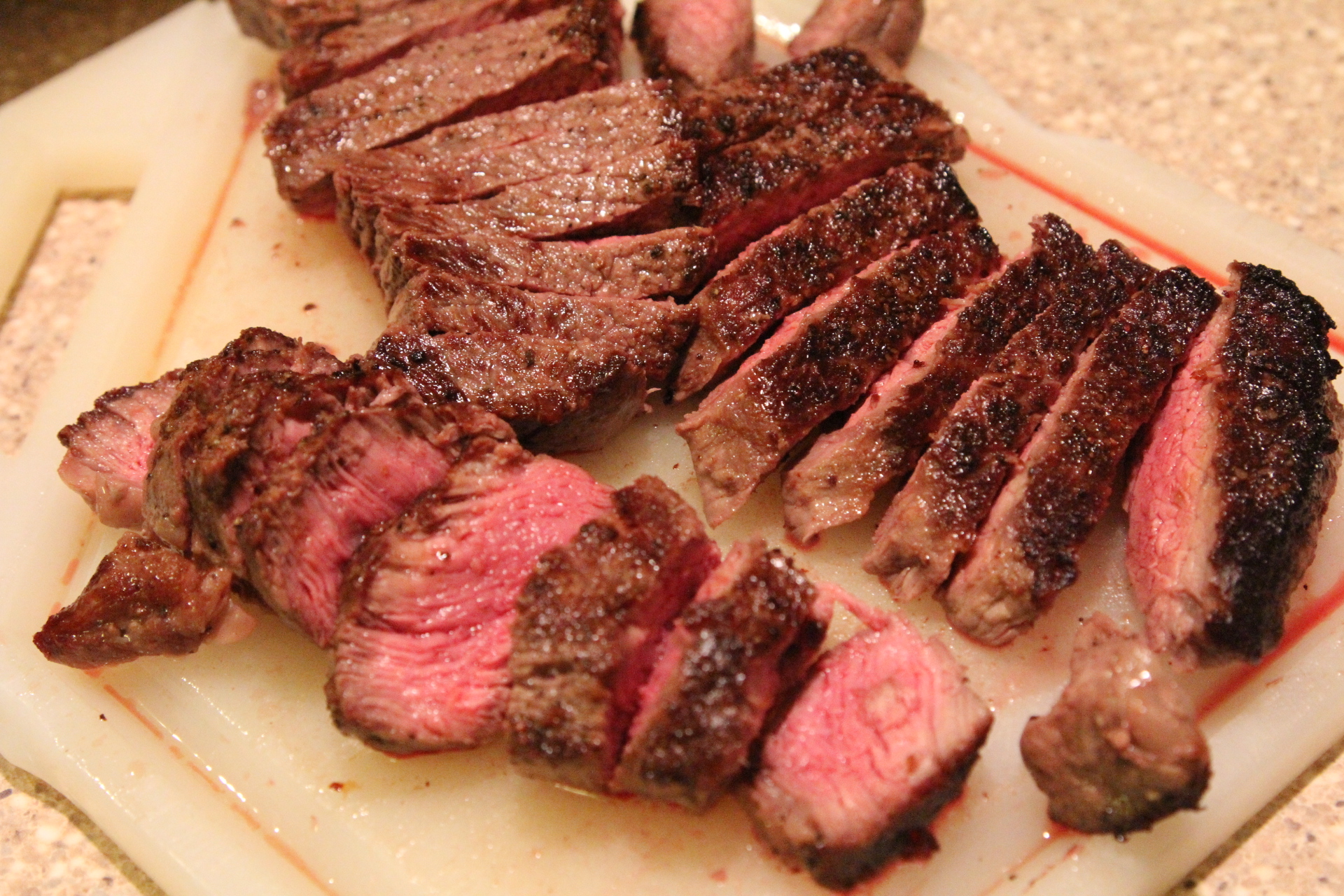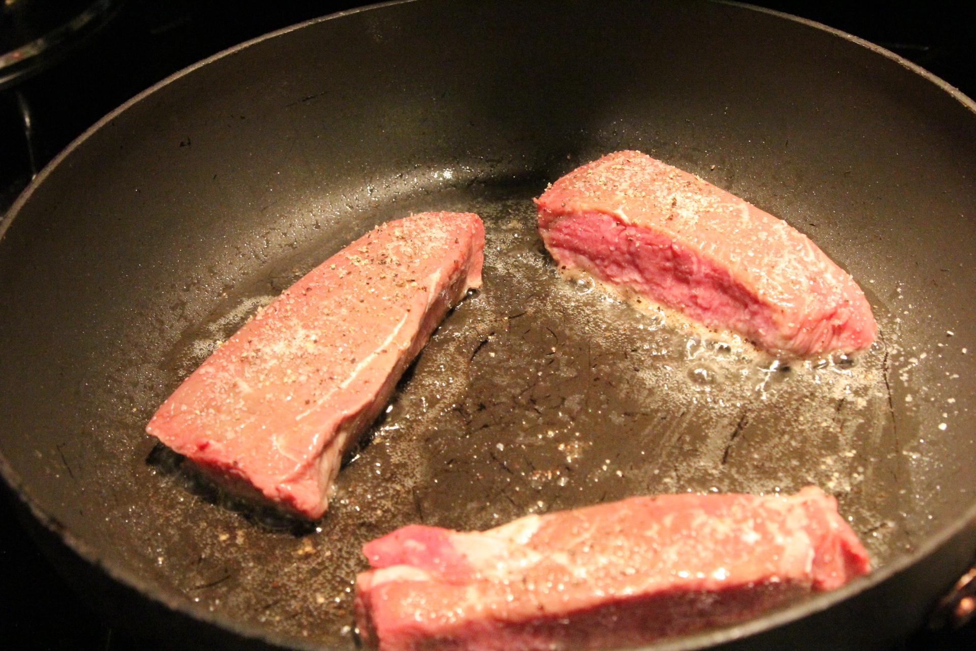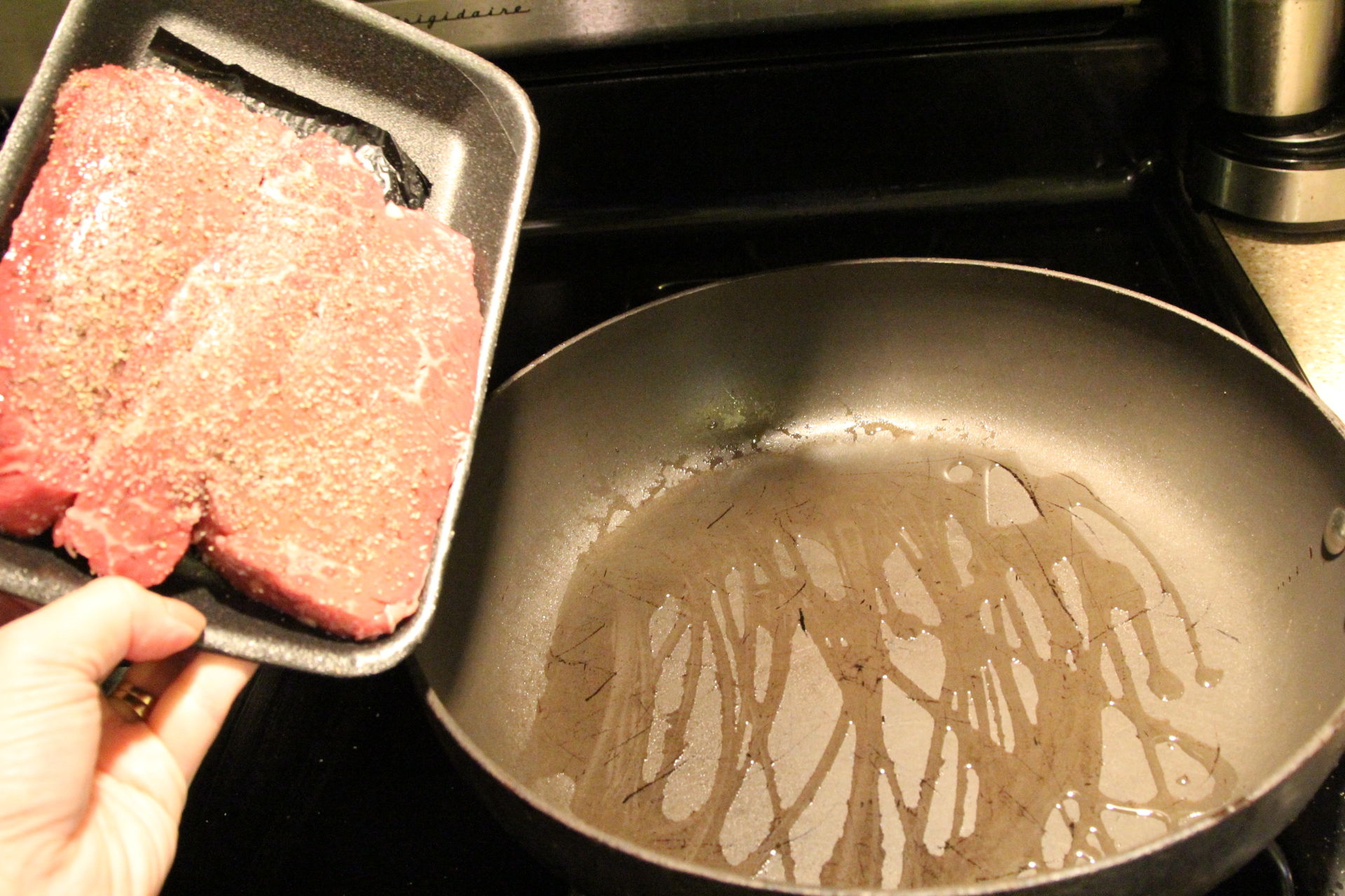 Place the steak in the hot skillet and cook for 3-5 minutes per side, only turning once, until the meat is done to your liking. You may have to turn the heat down just a little or partly cover the skillet with a lid if the oil is really splattering and making a mess. I like a nice medium rare steak so mine are pretty pink inside. Cook yours however you like. You could also grill the steak on your outdoor grill.