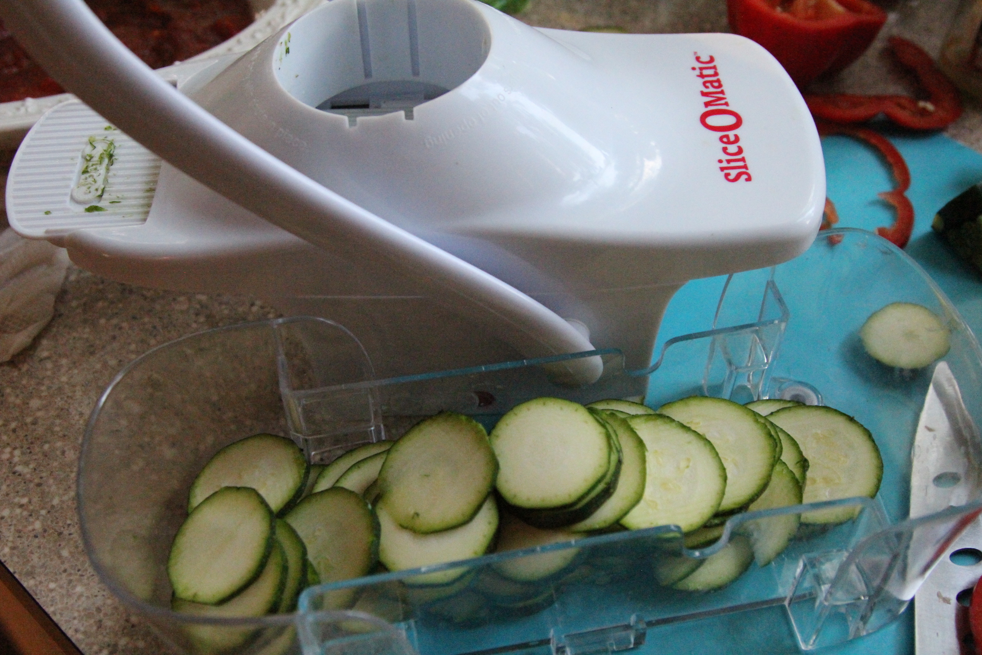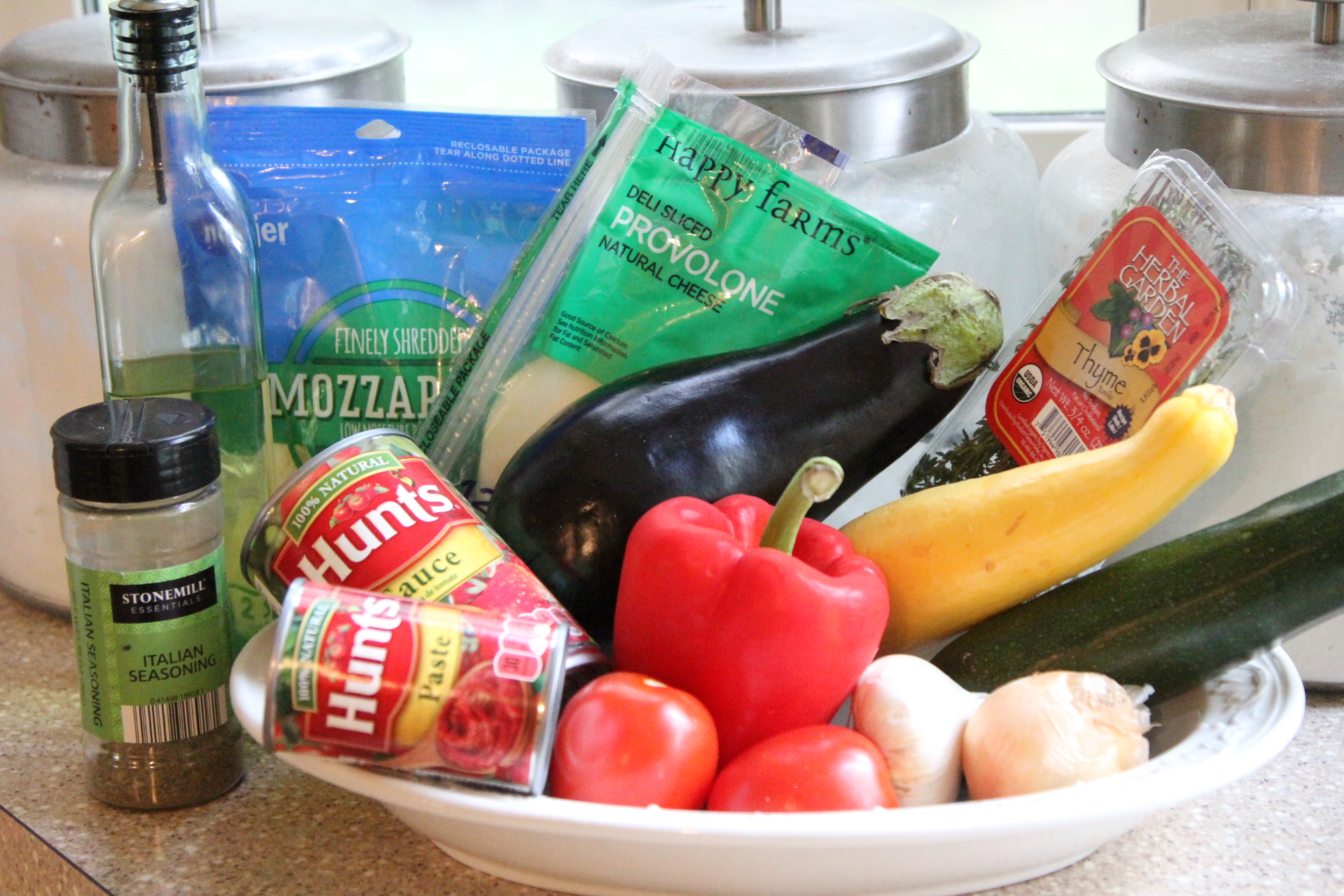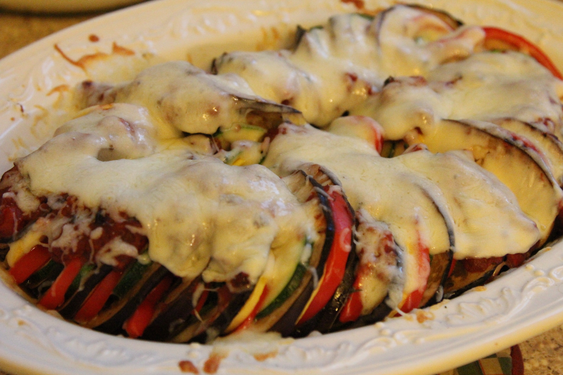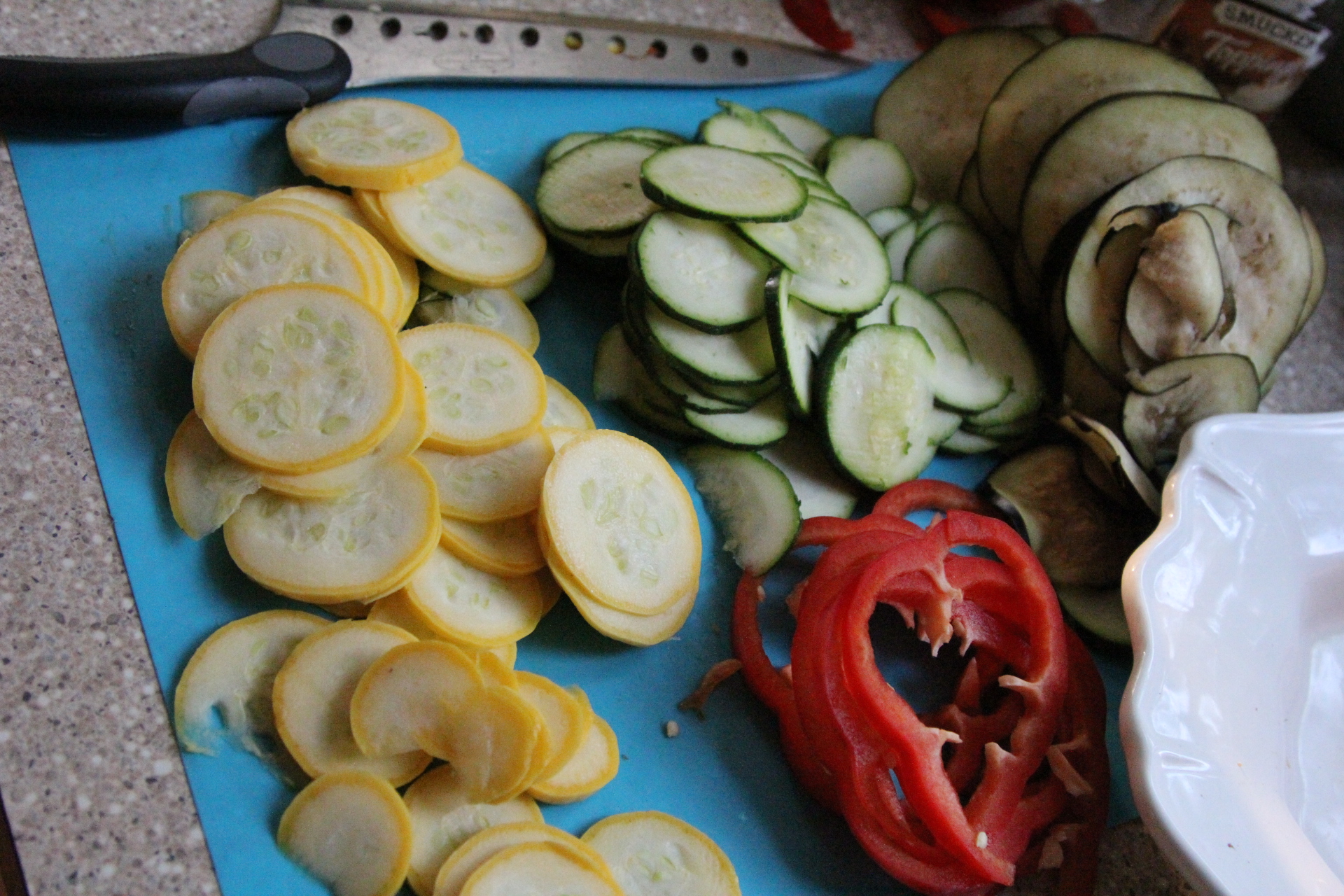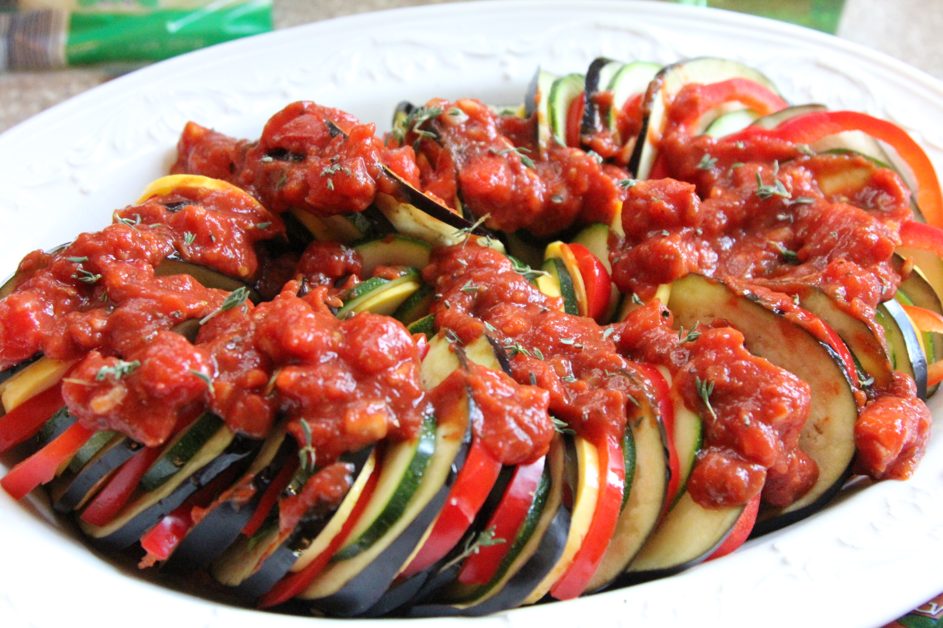 I do not own a mandolin slicer. Instead, I had a Slice O-Matic As Seen on TV type slicer. It worked ok, but toward the end, it’s cheaply made blade apparatus was clogging and jamming and I didn’t want to lose any fingers so I ended up just cutting most of the veggies by hand. My Eggplant and red pepper were way too large to fit in the feeding shoot anyway, so those had to be cut by hand. I guess I will be investing in a mandolin before I make this again! You want to slice the veggies fresh. Especially the eggplant and zucchini because they brown easily when sliced. Here’s another tip, try to buy long, skinny eggplants and peppers. You want to try to get the same circumference width across the board with your veggies. You can change up the veggies to your liking, but I stuck with the traditional Ratatouille veggies of Eggplant, zucchini, yellow squash, and red pepper. I kept mine vegetarian, but you could also brown up some sausage or even Italian sausage and top the dish with that to add a little protein to the dish and serve it as a main course. Remember when I said in a previous post that eggplant, zucchini and really any type of squash are not veggies I’ve been able to say I enjoy. But I loved them in this dish, just as I did in the Balsamic Steak and Veggies that I posted last week. I wouldn’t lie. If I don’t like something I make, I don’t post about it. I loved this dish. Bring on the veggies! I hope you give this one a try!