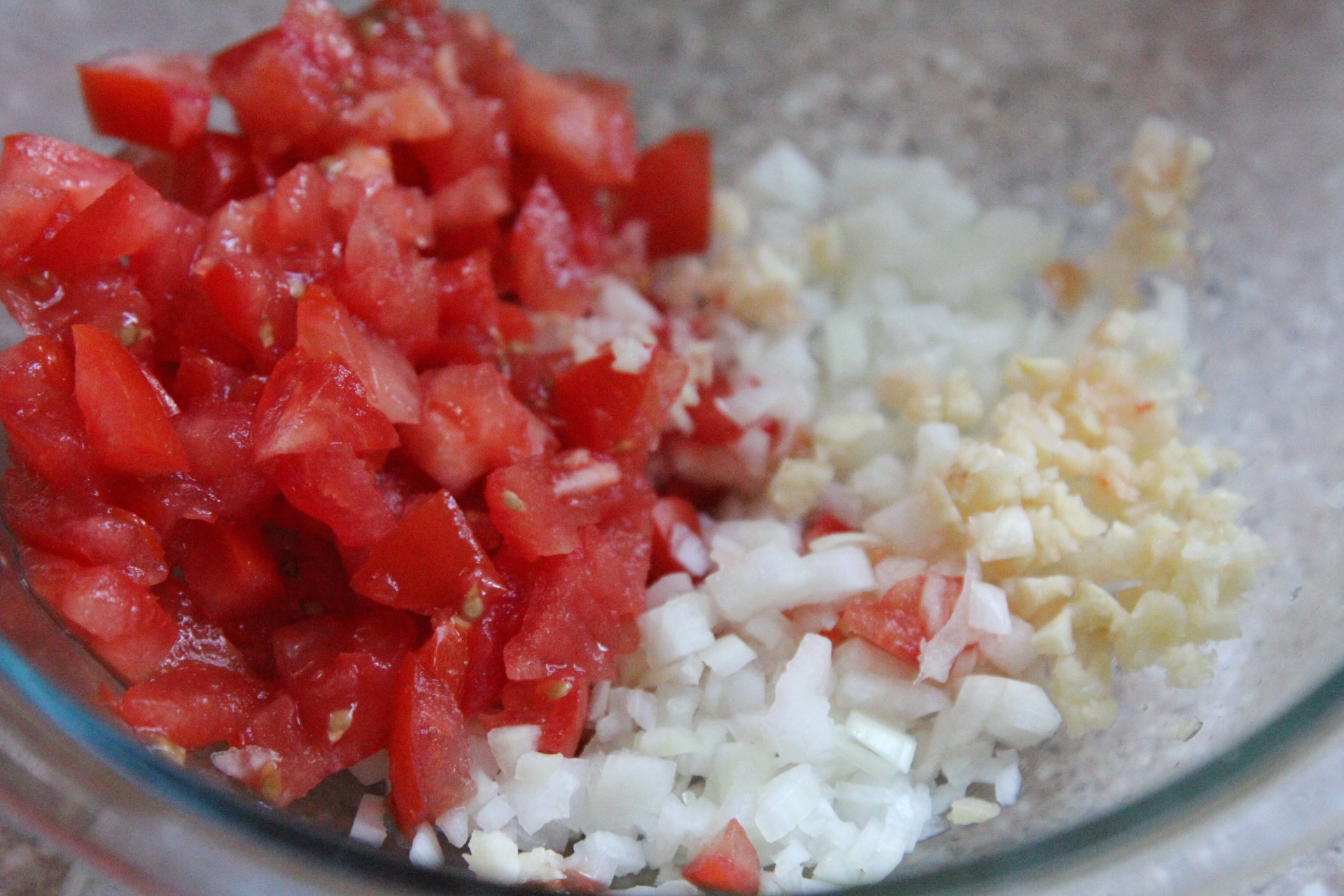 In a medium to large bowl, combine the diced onion, tomatoes, and garlic.