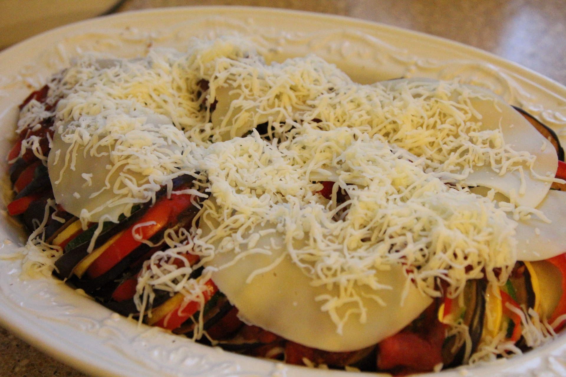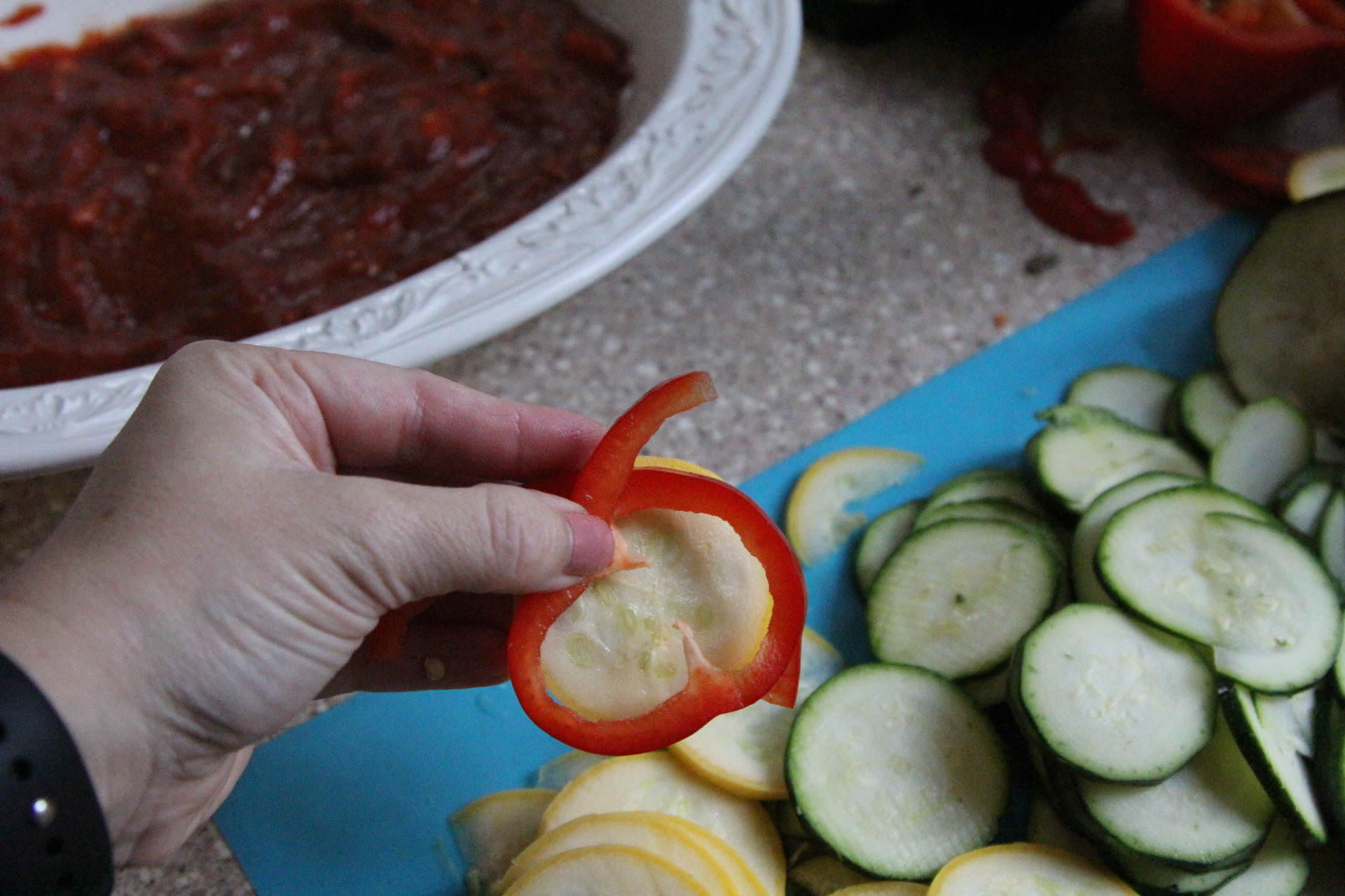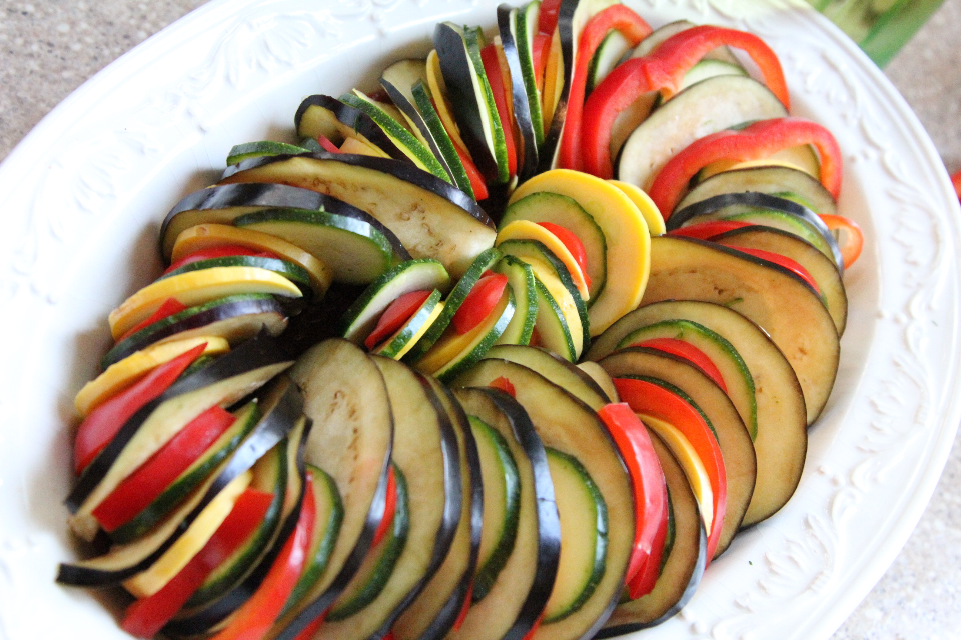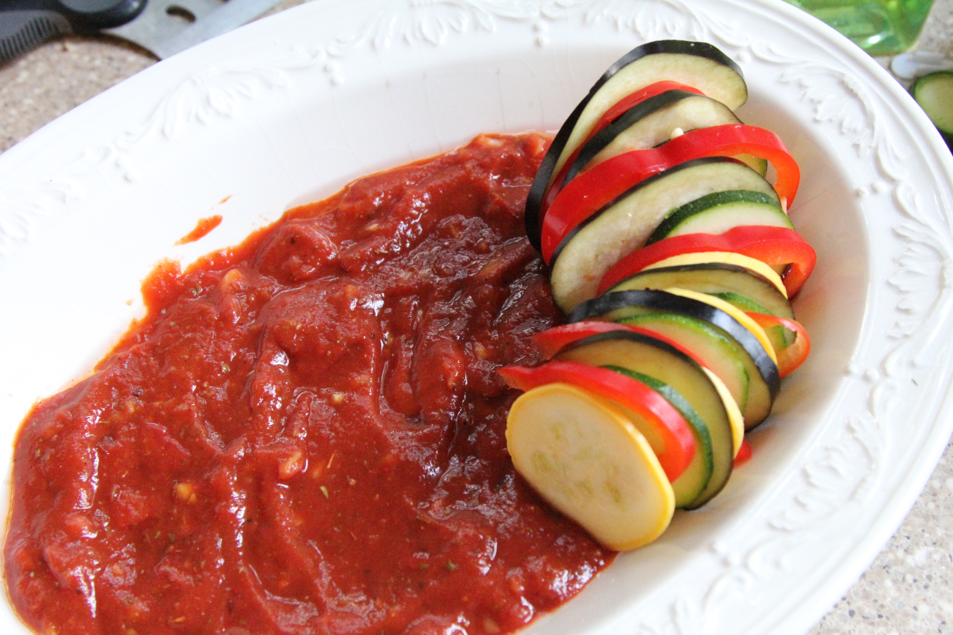 Pour about 1 1/2 C of sauce into the bottom of your baking dish. Begin on the outside of the dish, arranging the vegetables on their edge so their colorful peel shows and work your way around the edge until you get to the center. Just keep repeating your pattern of veggies until you are at the center.