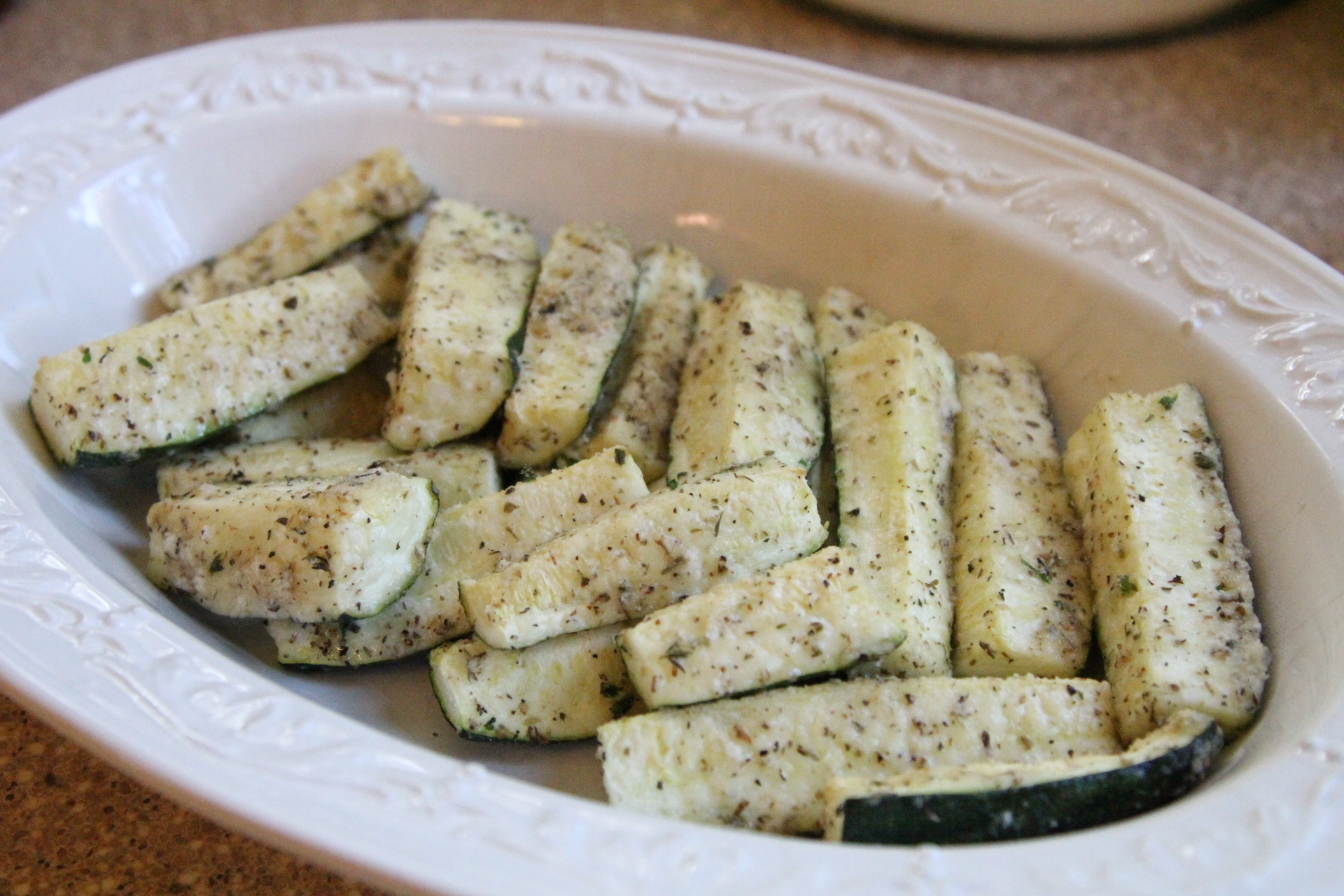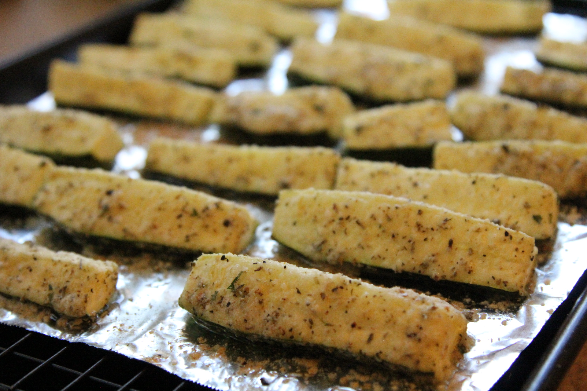 To continue my quest for tasty ways to prepare and actually eat those prepared veggies, I found another great way to enjoy Zucchini. I didn’t create this recipe, I saw it on Pinterest from damndelicious.net and thought that it looked pretty easy and tasty. Go here to check out the original recipe. There’s always all kinds of great recipes floating around from that website. You can change up the seasonings to whatever flavor you like, but the idea of lightly coating zucchini wedges with a little olive oil and then coating them with spices and parmesan cheese is the basics. Baking these in the oven with a finish on the clock under the broiler helps to keep the outside a little crispy and they work well as a side or even an appetizer.