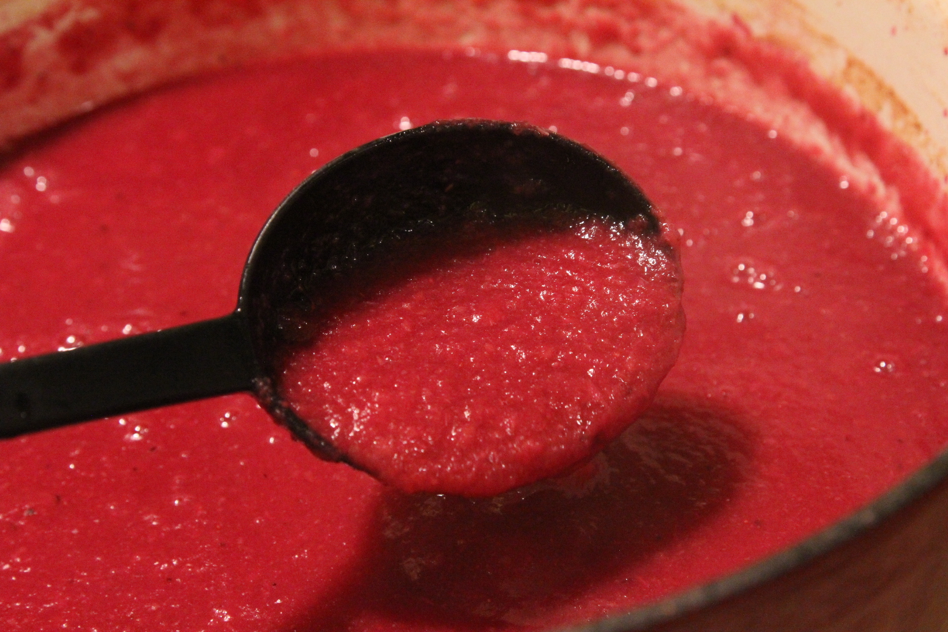 I thought applesauce would be an easy way to make use out the apples, and would be good for a year since I was canning it. I’m definitely not a pro when it comes to canning, but since I ventured into the world of canning strawberry jam this summer, I am eager to see what else I can preserve in those pretty jars! My mom always canned applesauce when I was little and I remember some of the jars had pink applesauce or rosy applesauce as she called it. She said she used red hot candies in the apple sauce to give it the cinnamon taste and it turned it a pinkish hue. I definitely wanted to make a few varieties. If I’m going to make the kitchen messy, I’m going to go all out and get some variety into the mix. I thought both strawberry applesauce and blueberry applesauce would be good since I had plenty of frozen strawberries and blueberries in the freezer from my slightly obsessed summer orchard picking. I also choose to keep the skin on my apples. I just cored and sliced them with a little handy apple slicer and dropped them in a big pot. I don’t want to leave out all the vitamins and fiber in that beautiful apple skin. The skins are easily broken down and pureed by my trusty immersion blender. To clarify, this is not the same immersion blender which I’ve now reserved and use for making laundry soap. I guess a good washing would make the same blender fine to use in either application, but I certainly don’t want to chance my applesauce tasting like patchouli! Ha! So I have a cooking one and my old one which has a little handy electrical tape on the cord from when I accidentally got it in the burner flame. Oops!