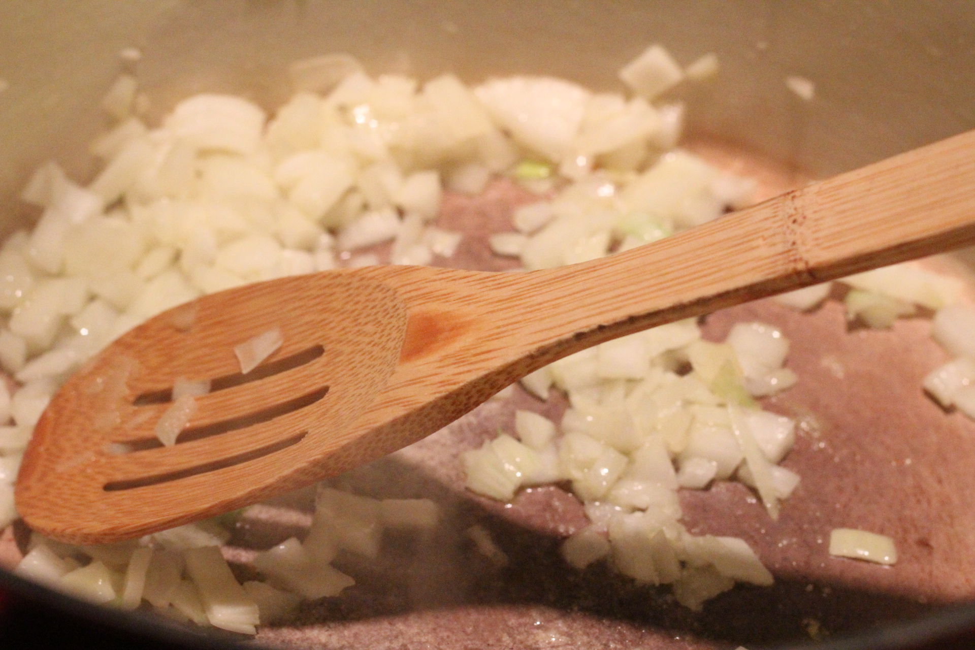 In a large soup pot, heat olive oil on medium heat. Add in diced onion and sauté for a few minutes until translucent. Add in minced garlic, lower heat so you don’t burn garlic.