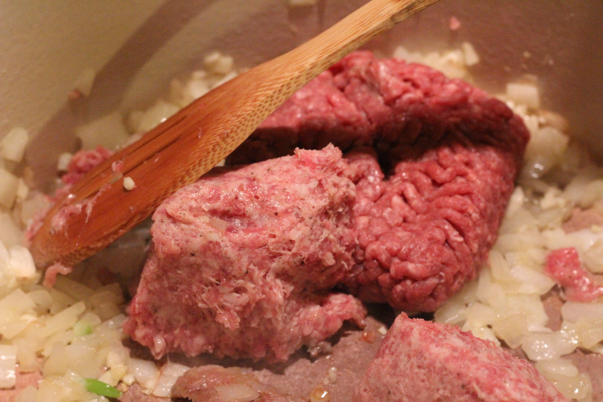 Add in ground beef and sausage. Stir and break this up until it’s cooked.