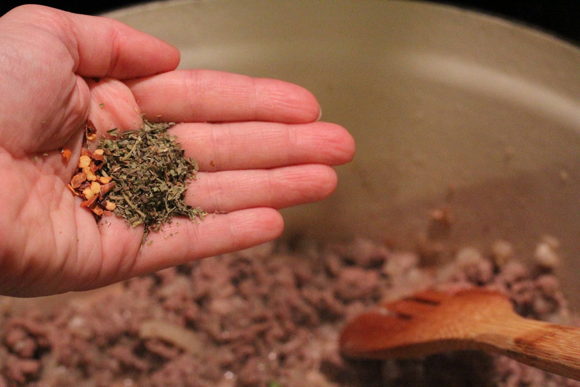 Add in the red pepper flakes and a little of the Italian Seasoning and pepper to the meat.